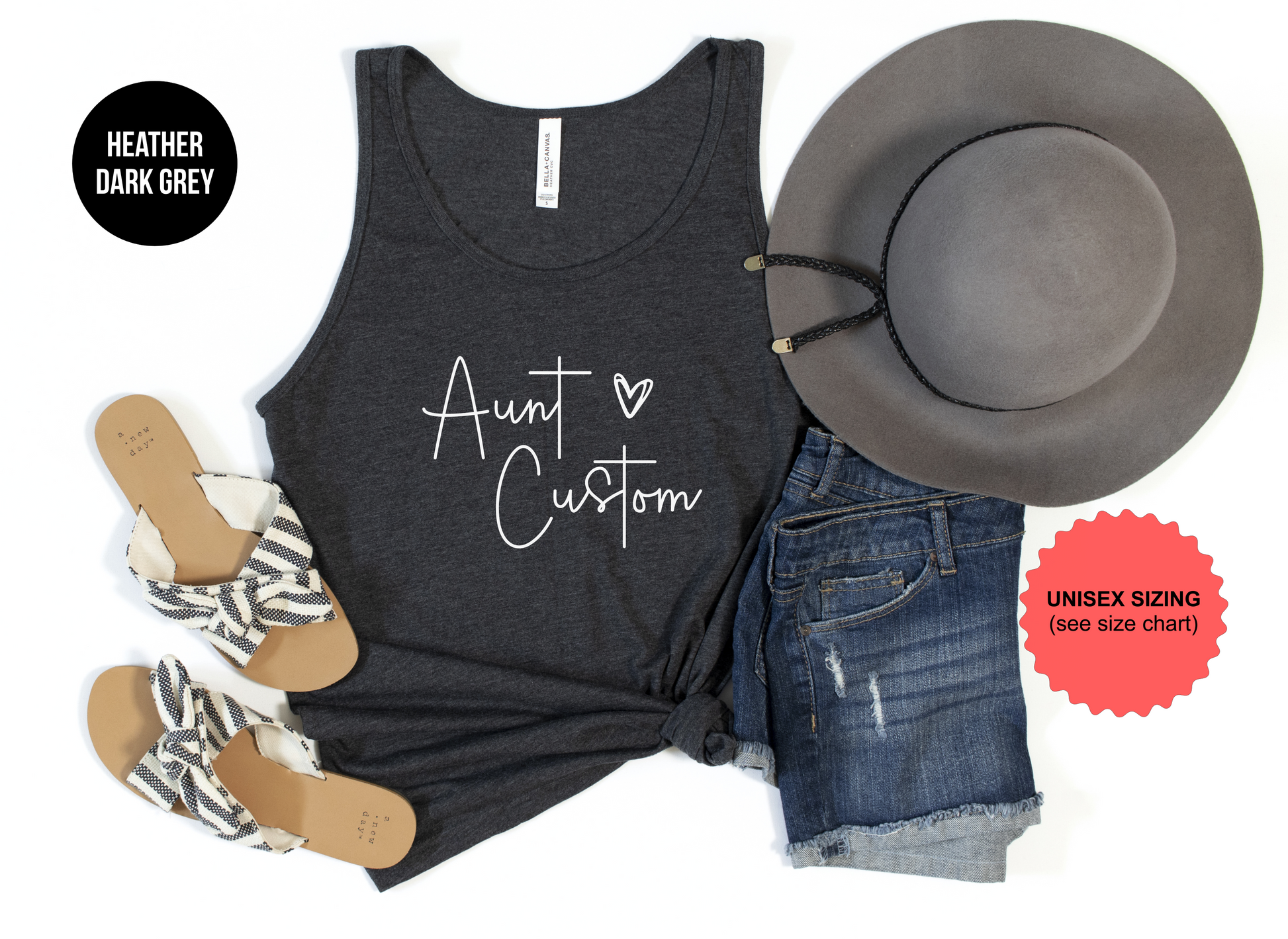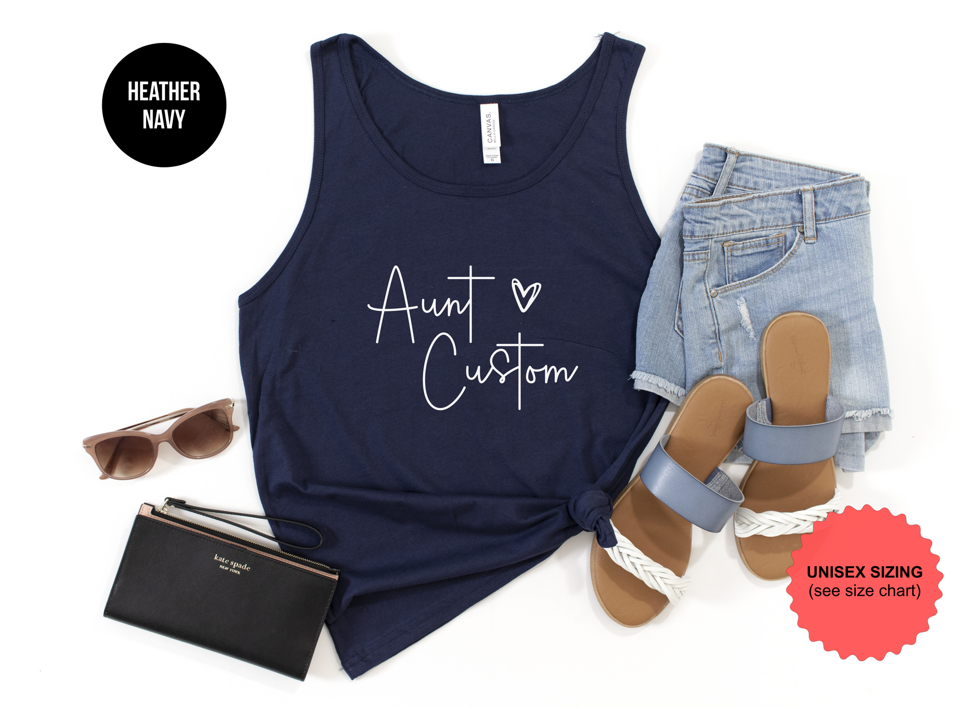 Make a statement with this one-of-a-kind Aunt Custom tank - perfect for that special aunt in your life. Customize the name, making it truly unique and tailored to her style. Perfect for birthdays, holidays, or just because! Hey, aunts need love too. Let her know with Aunt Custom.