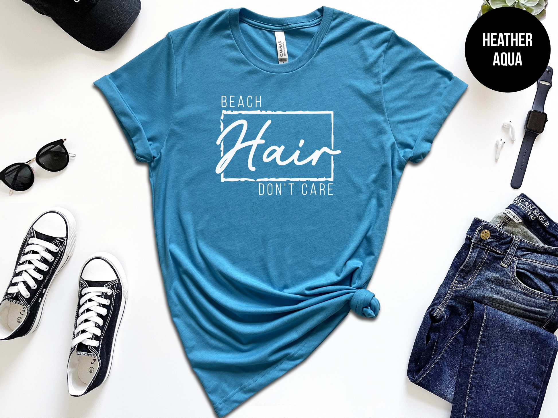Let your hair hit the beach without a care in the world! Make a statement with this 'Beach Hair Don't Care' t-shirt - perfect for lazy days spent in the sand. This comfy and fiercely fashionable top will be the ultimate highlight of your summer wardrobe. Be the coolest cat on the beach with help from The Shirt Republic!