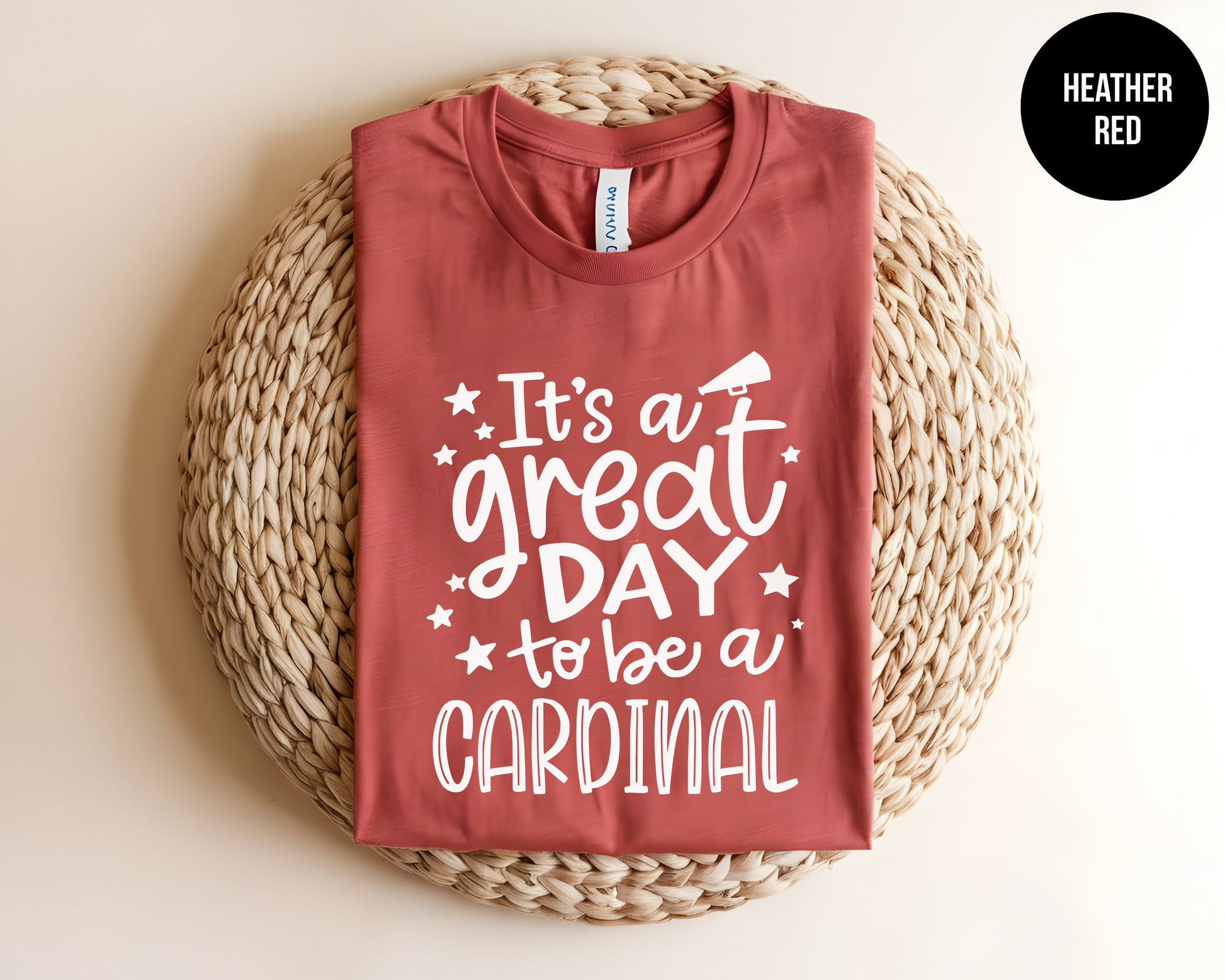 Bring the energy and school pride with our “It’s a Great Day to Be a Cardinal” shirt! This high-spirited design features playful fonts, stars, and a cheer megaphone — capturing the fun and pride of being part of the Cardinal community.