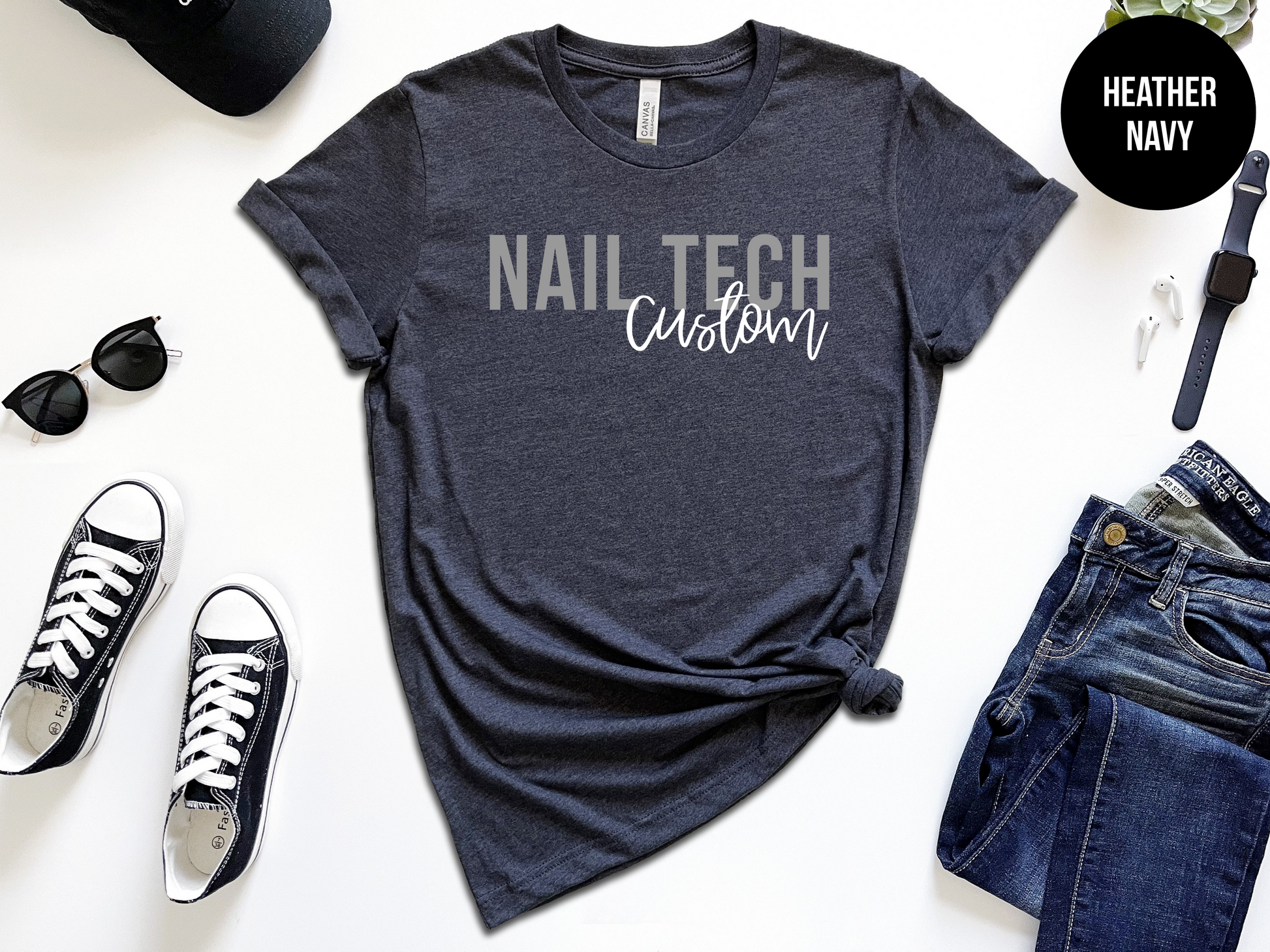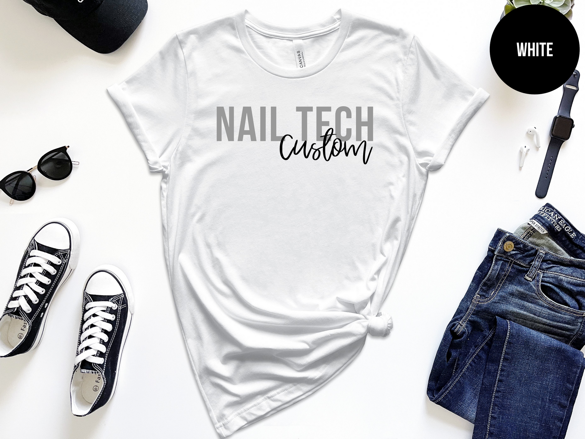 Looking for a fashion statement that stands out from the rest? Try the Nail Tech Custom shirt featuring YOUR custom name! Look classy and professional while showing off your unique style and nail tech flare! Stand out from the crowd (with help from The Shirt Republic of course)!
