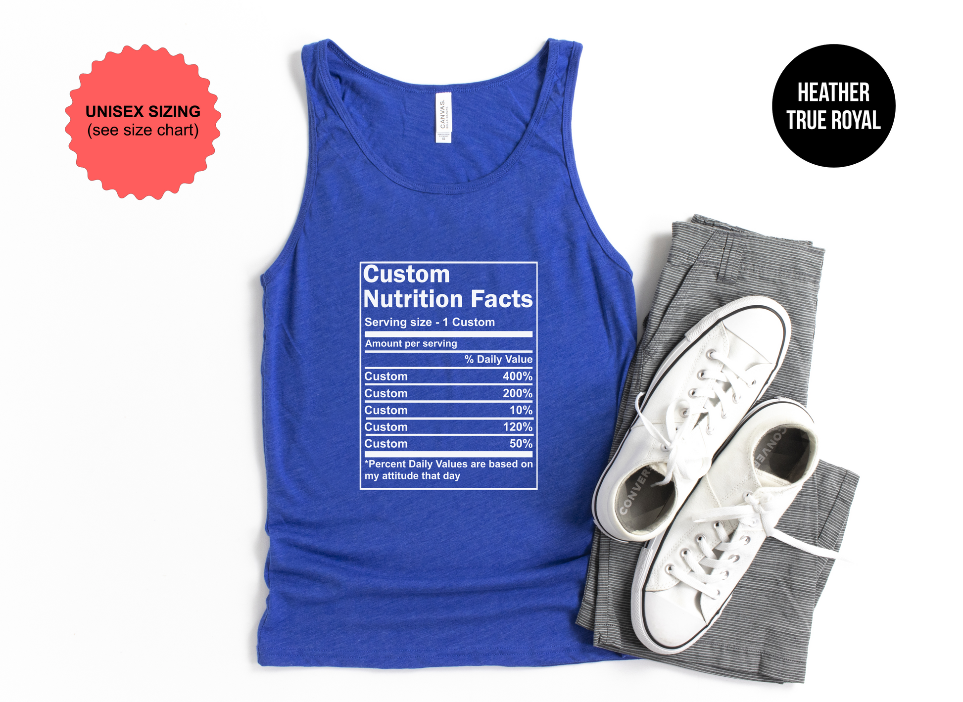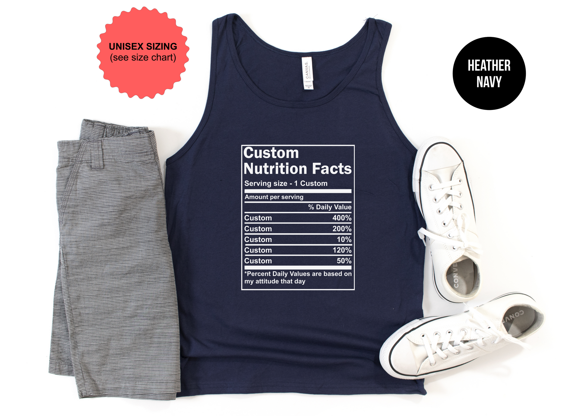 Lookin' to lay down some new nutritional facts? Get this Custom Nutrition Facts shirt from The Shirt Republic! It's funny, personalized, and a guaranteed conversation starter! Plus, nutritionists can't really argue with facts that you make up yourself...amirite?!