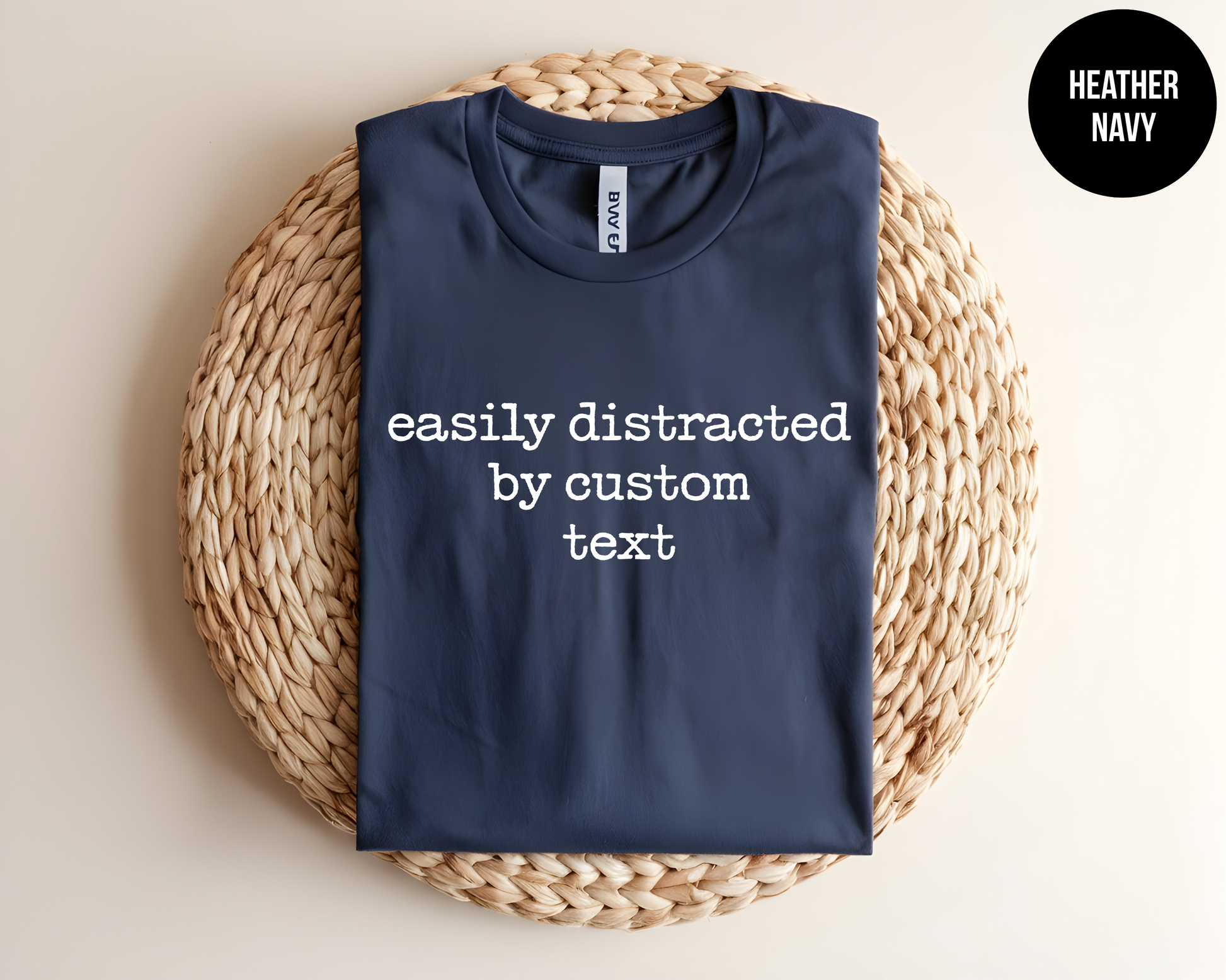 Personalize your distraction with this fun and fully customizable tee! Whether it’s coffee, cats, tacos, sports, or anything else that grabs your attention, this shirt lets you add your own text to make it uniquely yours. Made from soft, breathable fabric, it’s perfect for casual wear, gifts, or just showing off what truly steals your focus. Get creative, have fun, and let the world know what distracts you most!