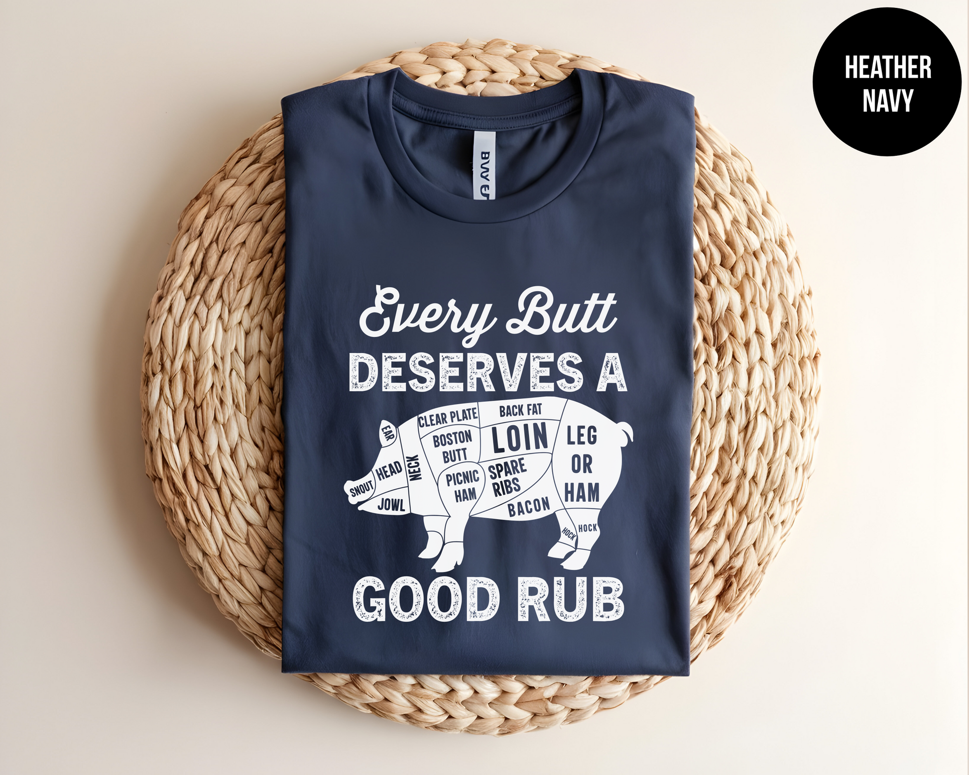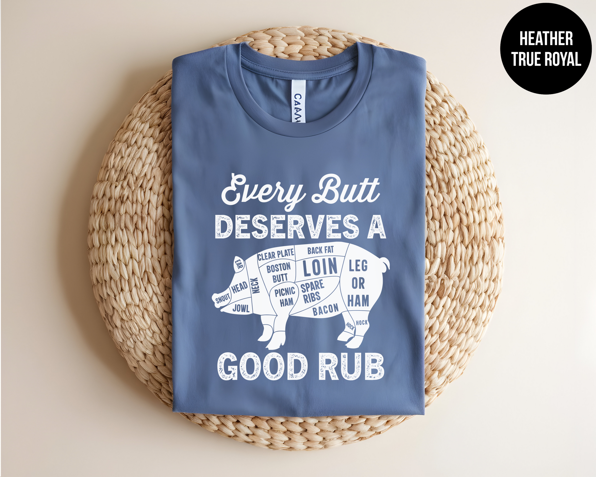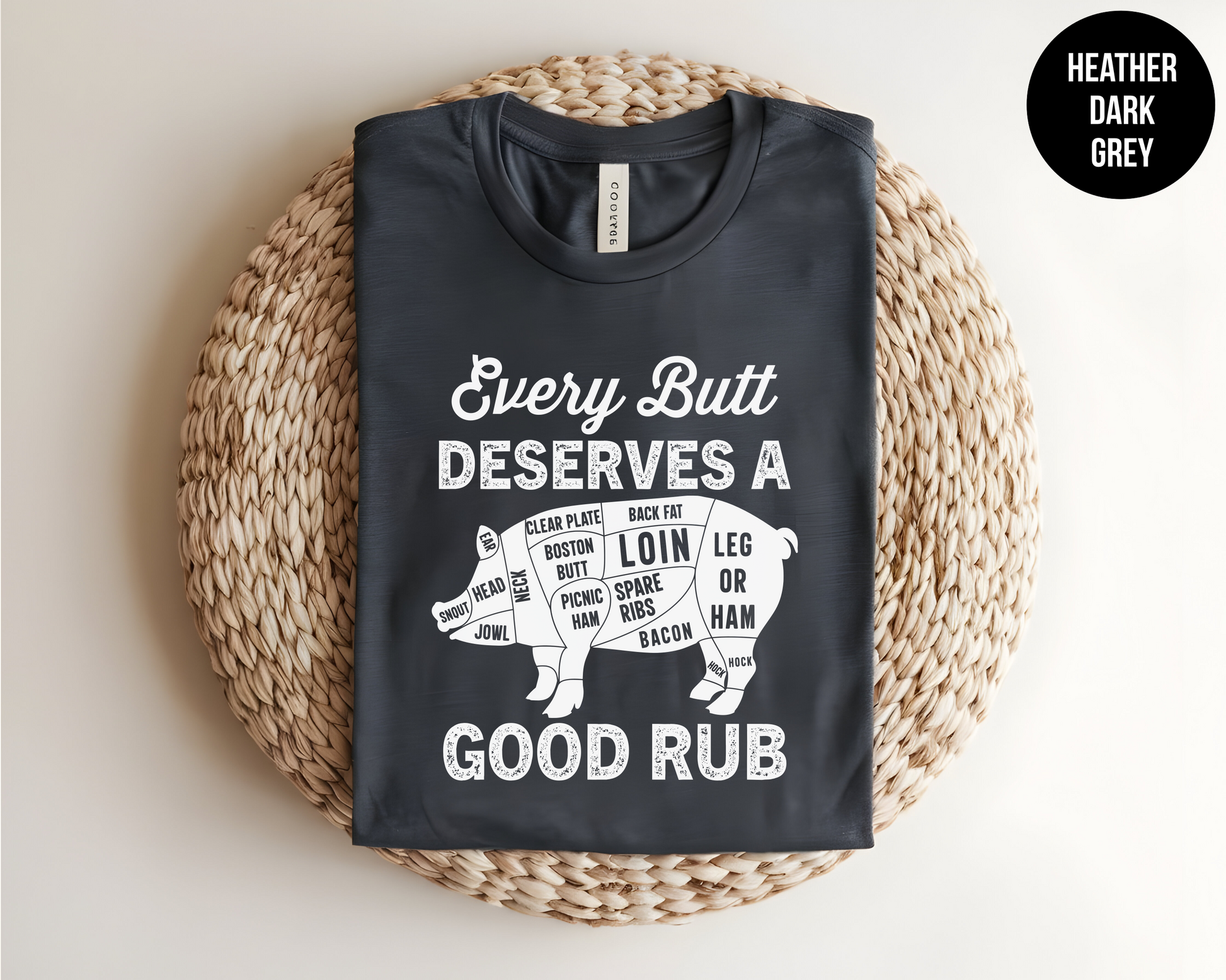 “Every Butt Deserves a Good Rub” with pig BBQ diagram