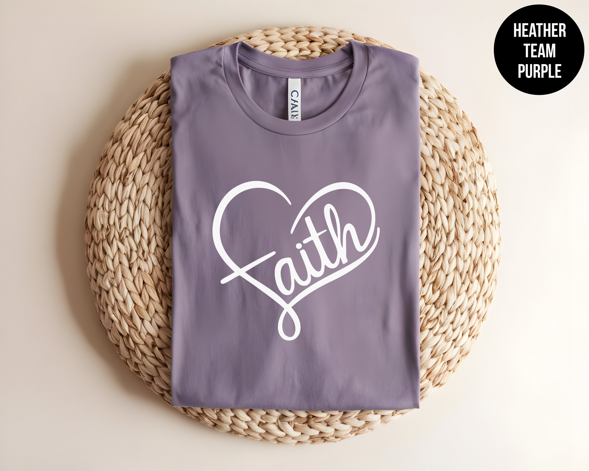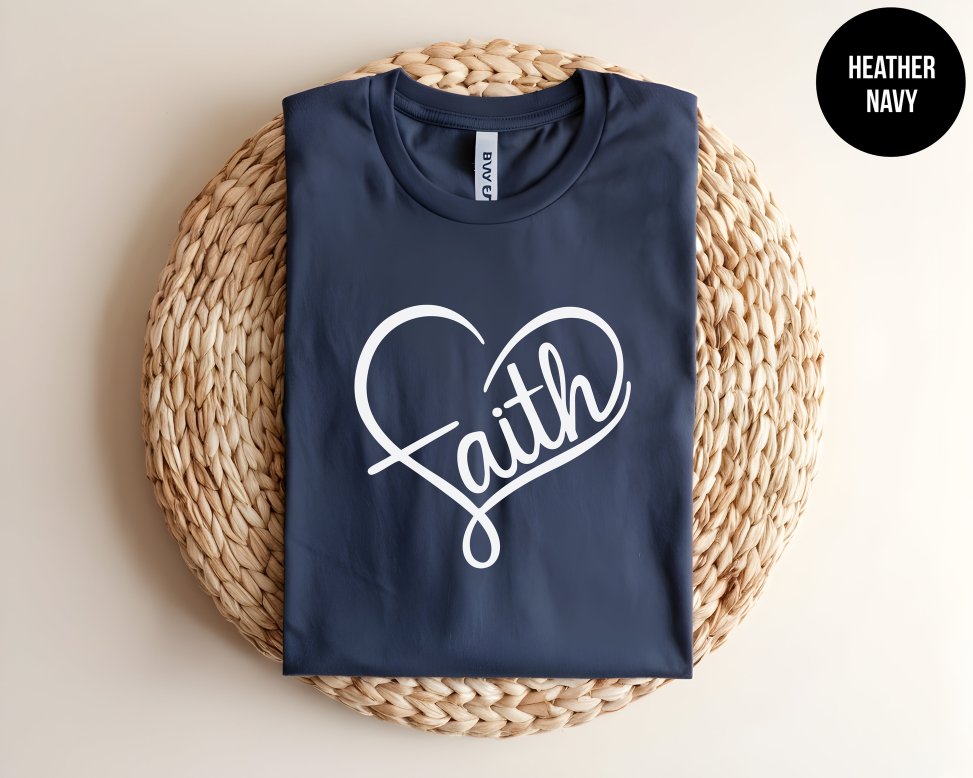 Show your devotion in style with this Faith Heart shirt, where the word 'Faith' is beautifully designed in the shape of a heart. A perfect blend of love and belief, this inspirational design symbolizes strength, hope, and unwavering faith. Whether for everyday wear, church gatherings, or as a heartfelt gift, this tee is a meaningful way to express your spiritual journey.