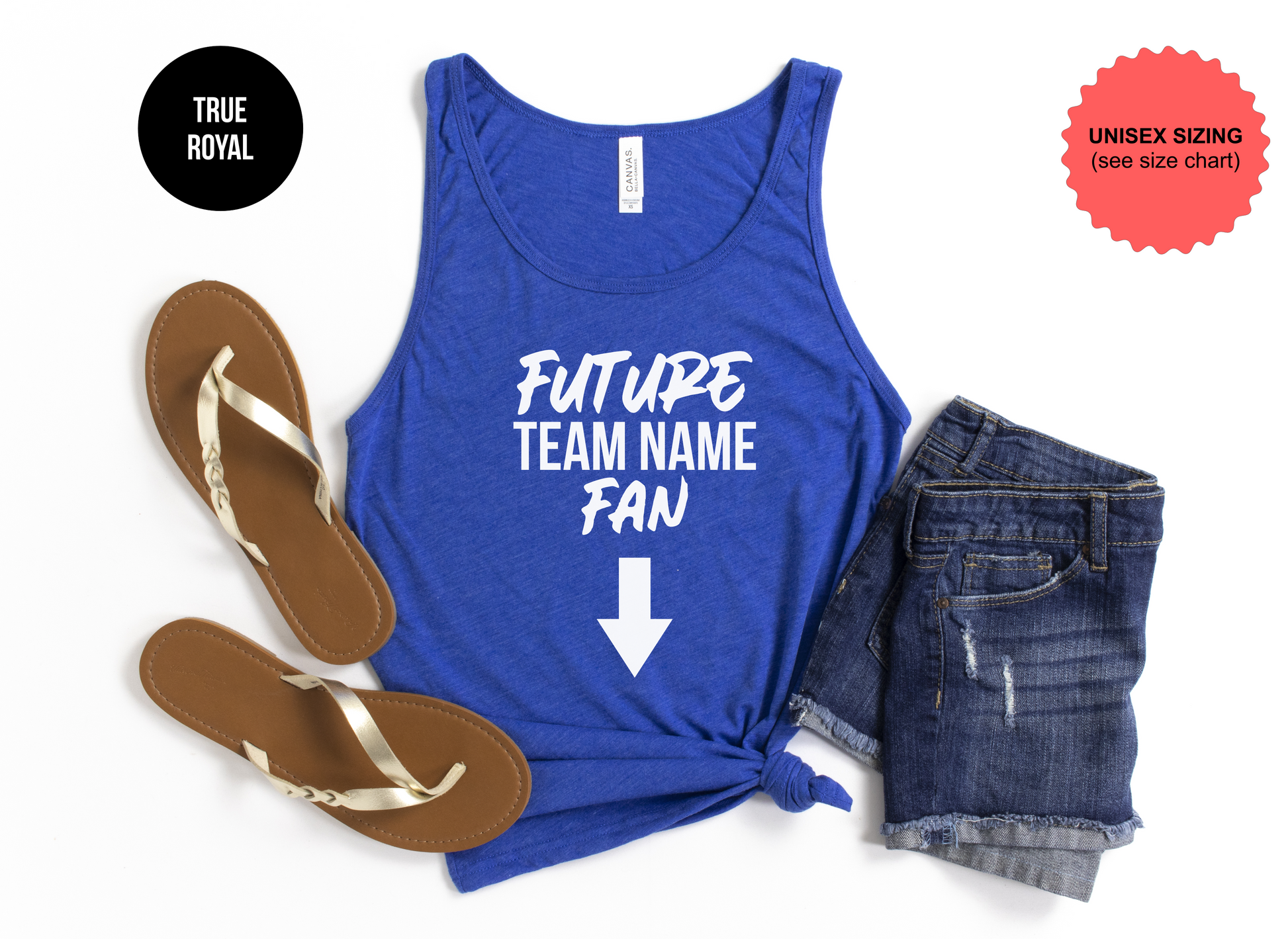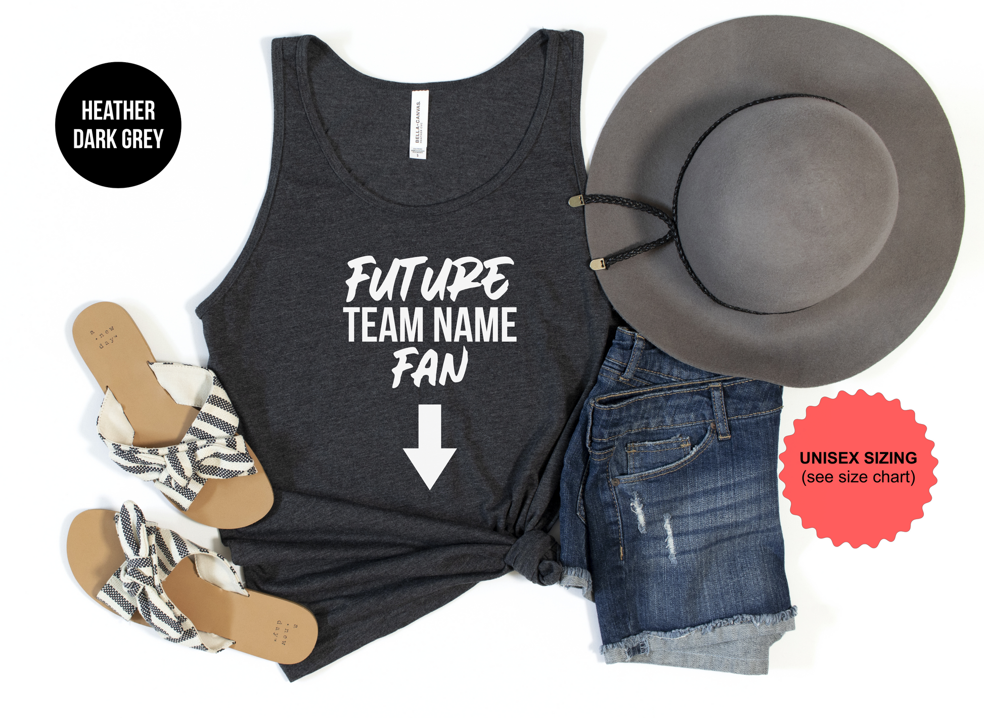 Let the world know who your little one will be cheering for with this adorable “Future [Custom Text] Fan” tank top! Featuring an arrow pointing down to your baby bump, this cute and comfy tank is perfect for expecting moms who want to show off their excitement with a personalized twist.