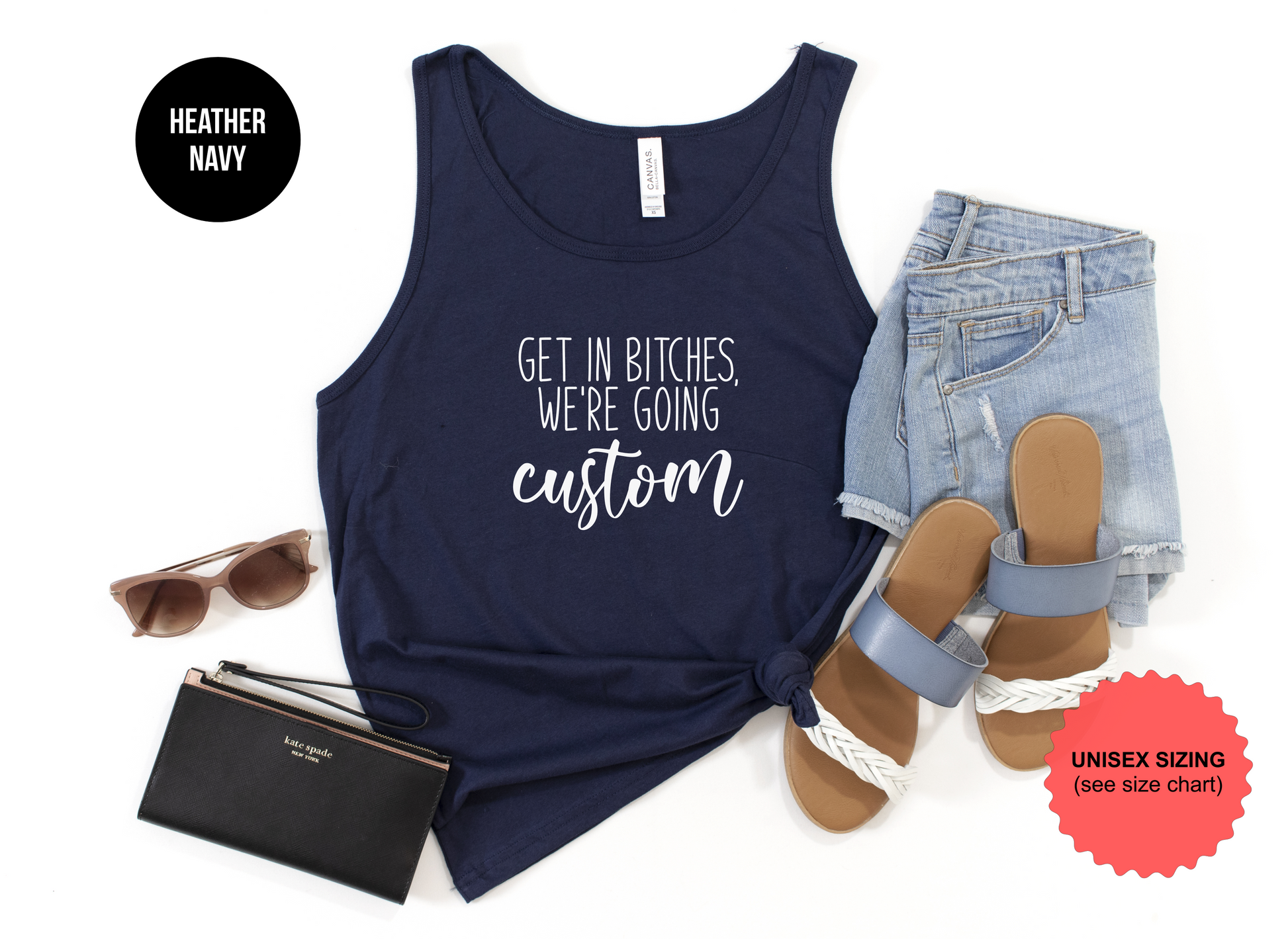 Make a custom statement with the 'Get In Bitches We're Going' tank top from The Shirt Republic. Show pride in your style with a personalized look that stands out from the crowd. The perfect way to have some fun while making a lasting impression!