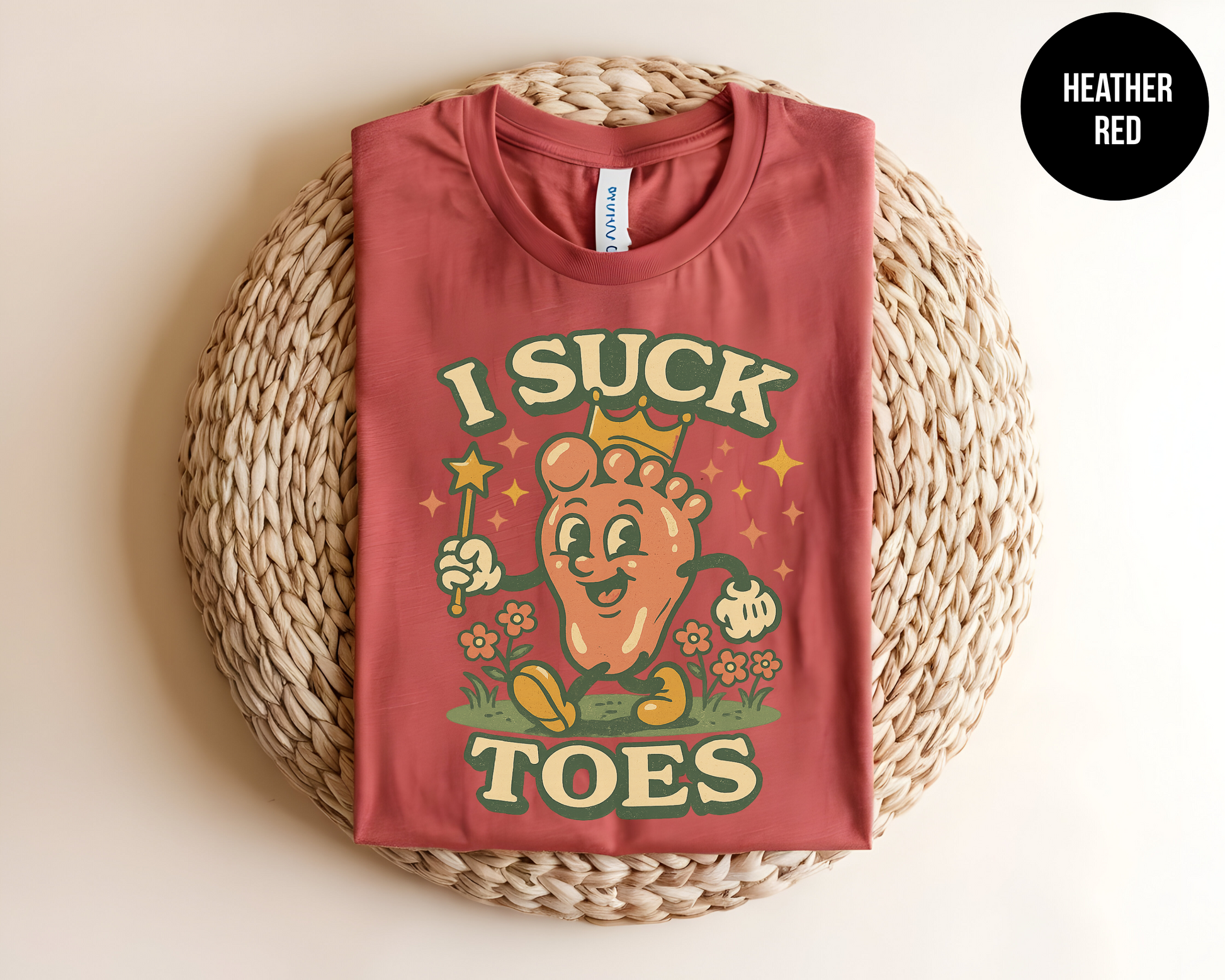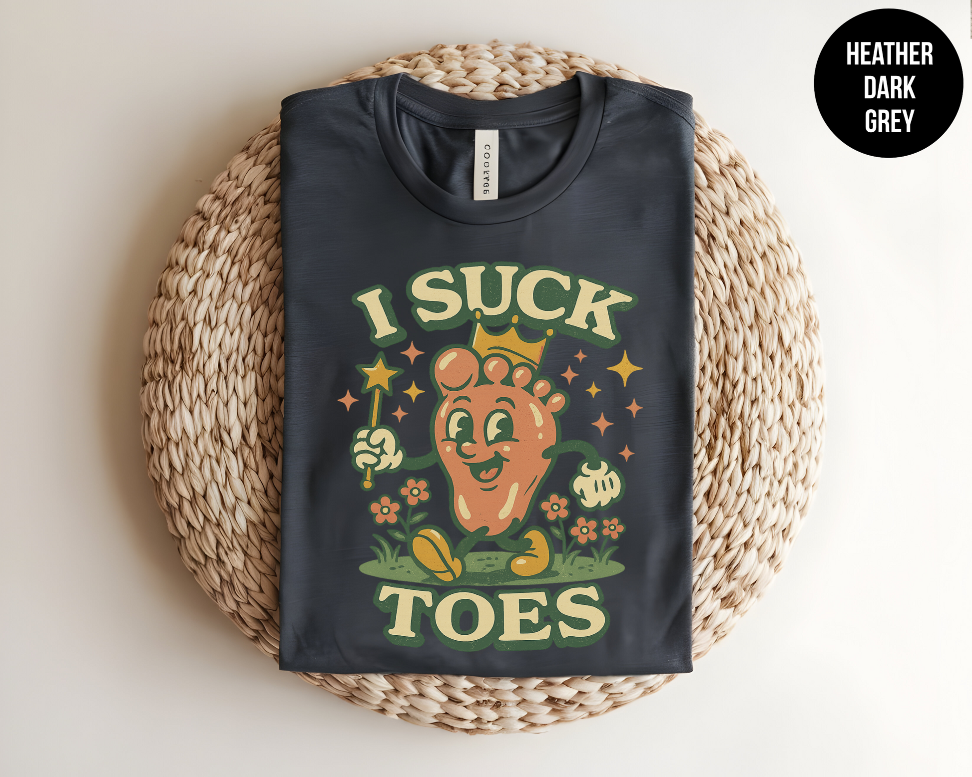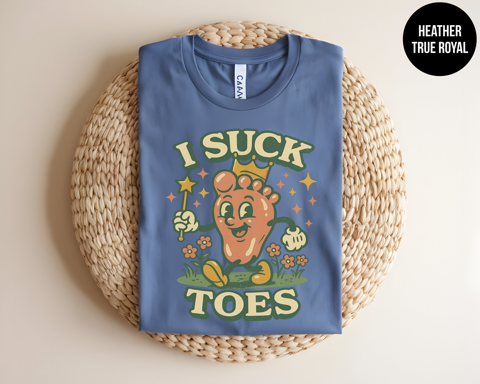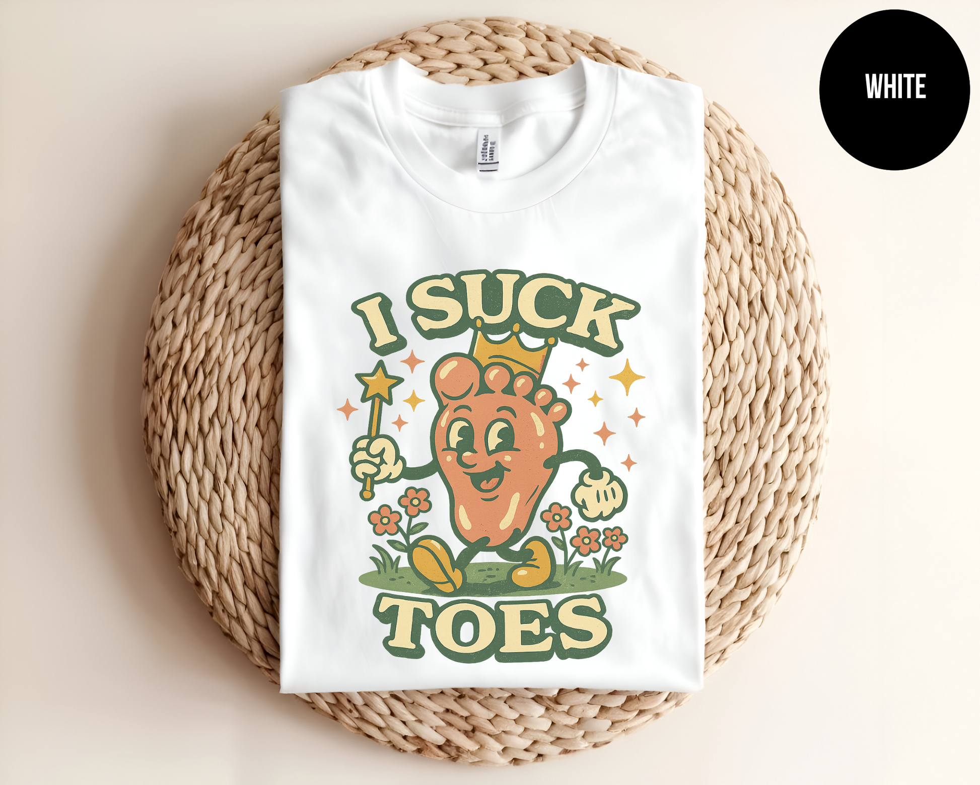 This “I Suck Toes” shirt is a hilariously unhinged design featuring a crowned cartoon foot holding a wand, surrounded by sparkles, flowers, and zero shame.