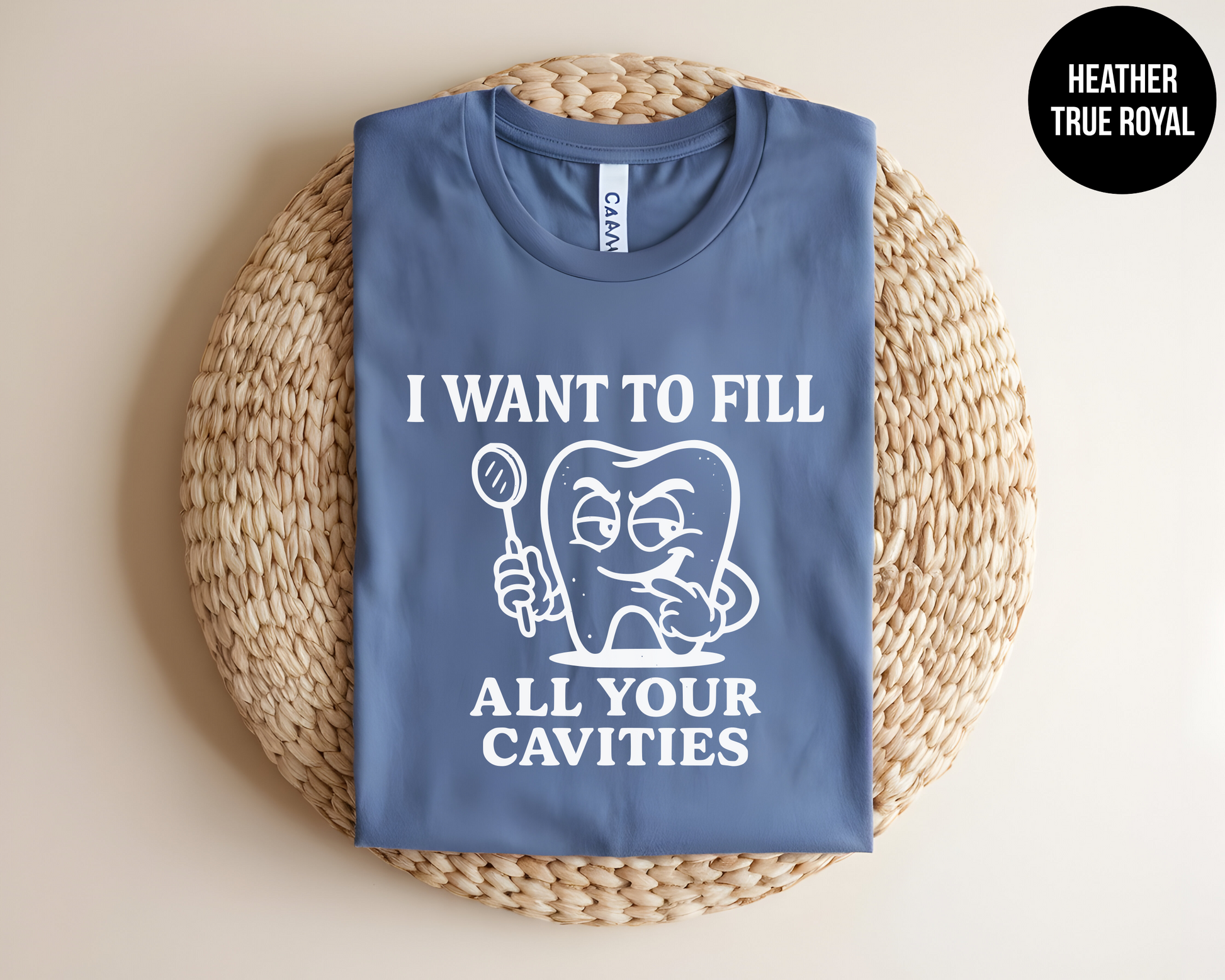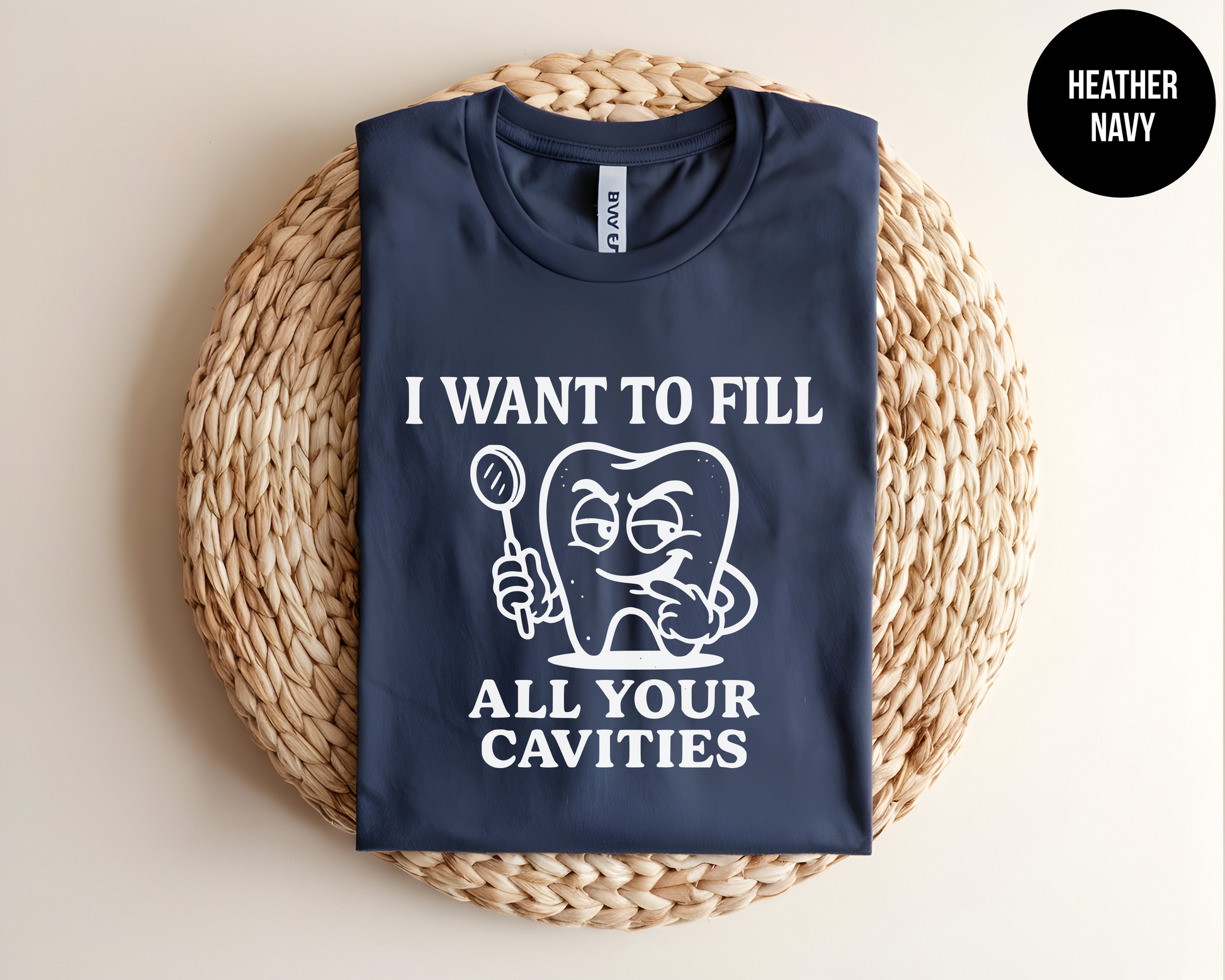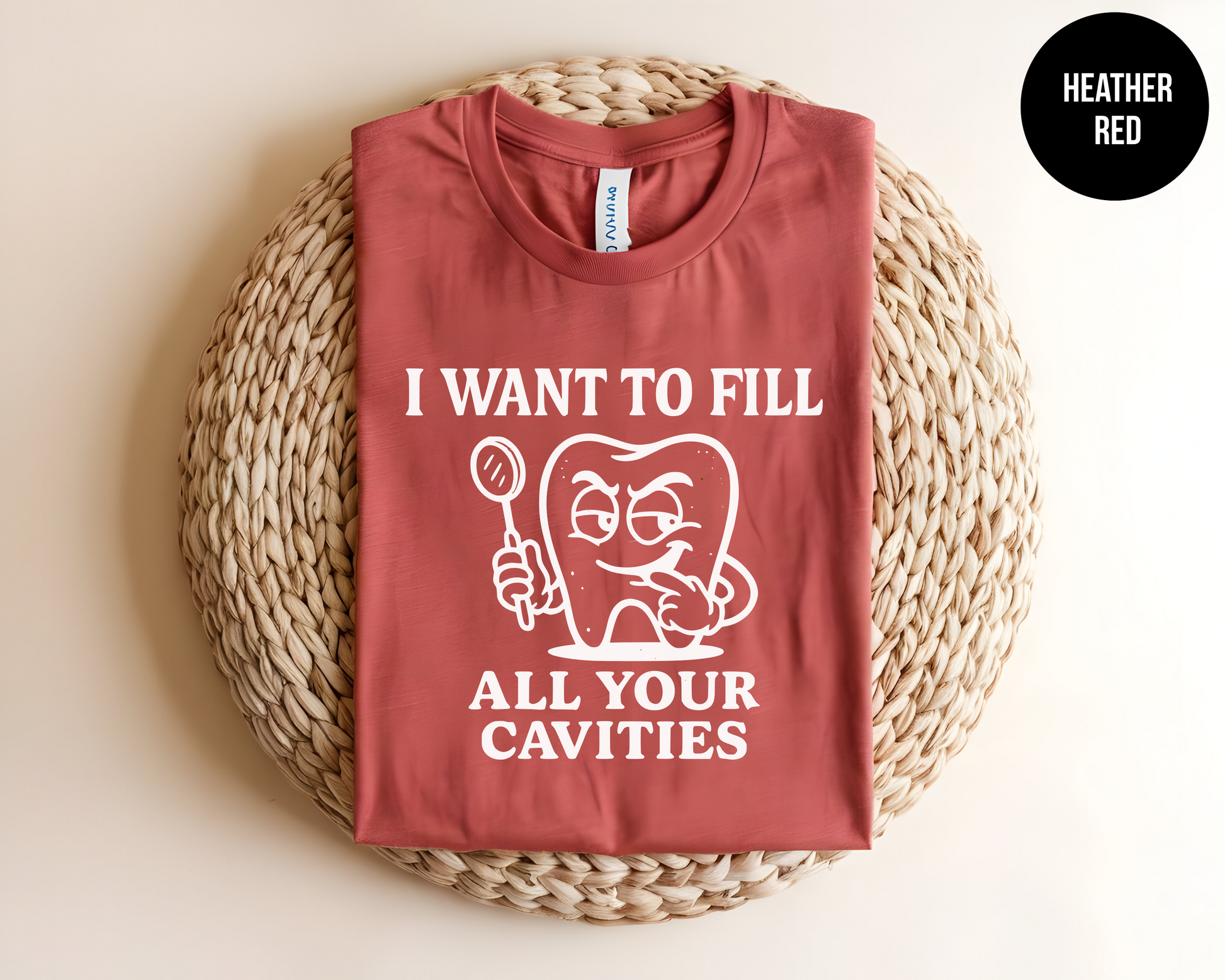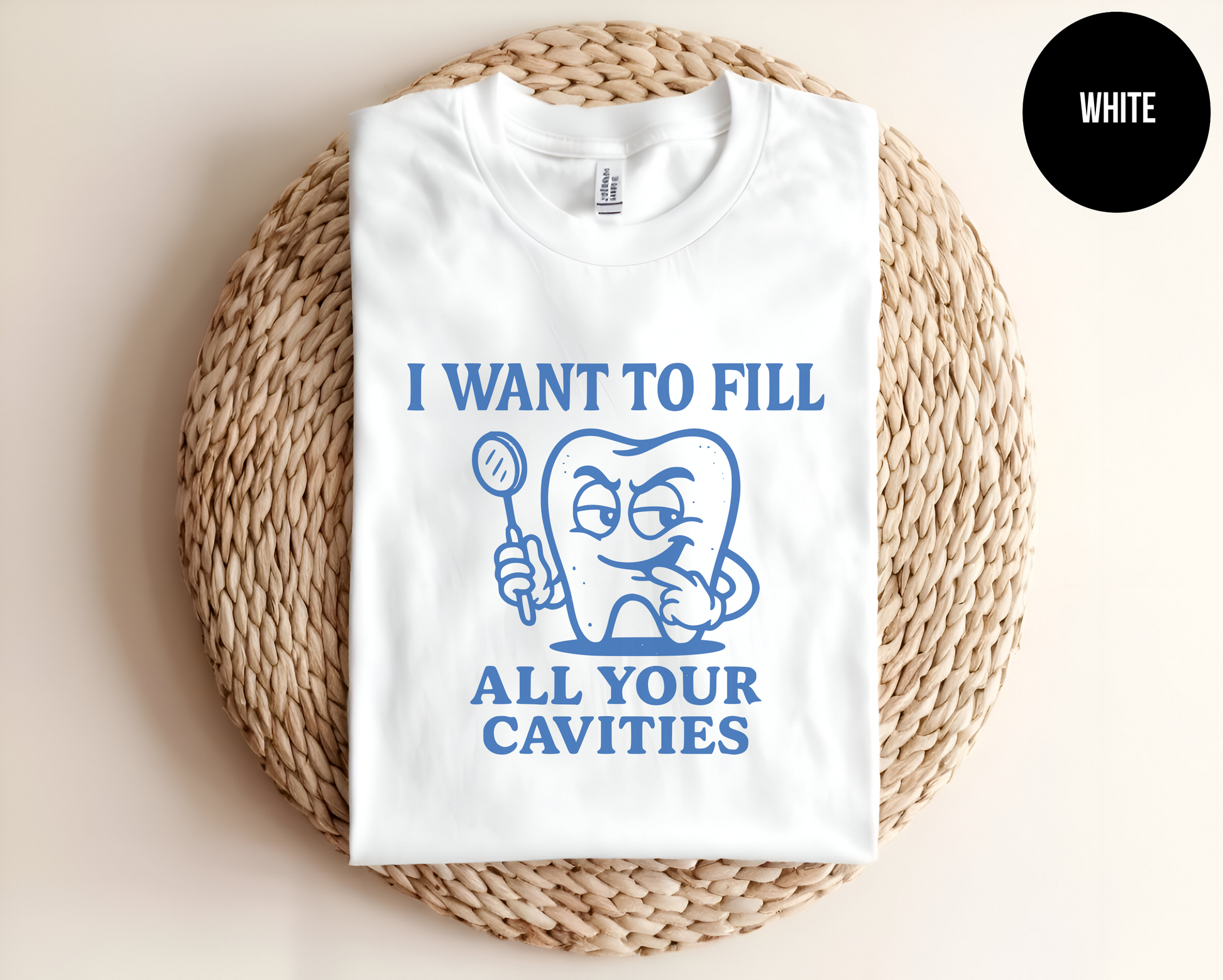 Sweet, spicy, and just a little bit wrong—our “I Want to Fill All Your Cavities” tee brings dental humor to a whole new level. Featuring a mischievous cartoon tooth and playful innuendo, this shirt is perfect for dentists, hygienists, or anyone who enjoys a good clean(ish) joke.