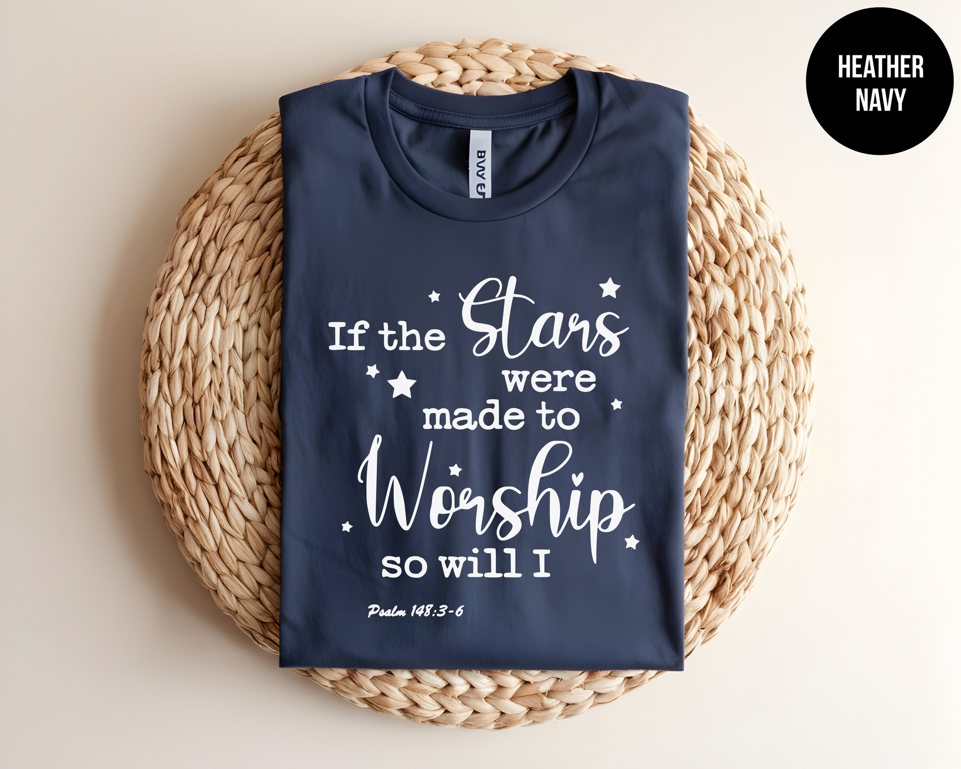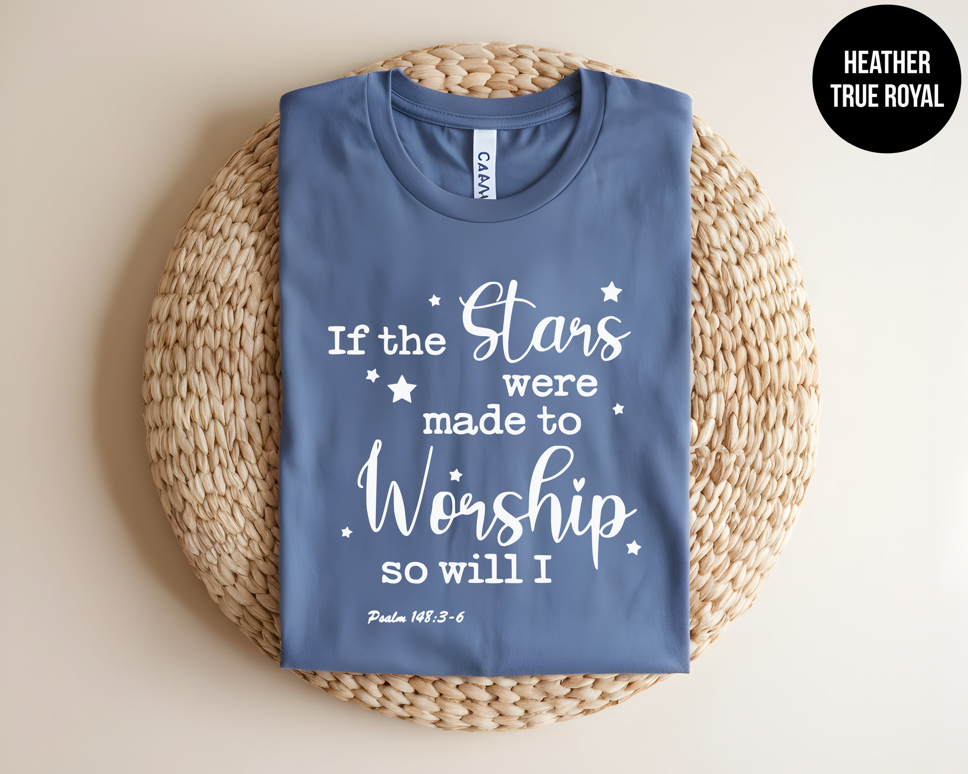 This beautiful and inspiring shirt features the phrase, "If the Stars Were Made to Worship, So Am I," a powerful declaration of faith and praise. Perfect for anyone who finds strength and inspiration in their beliefs, this shirt serves as a reminder of the divine connection between creation and worship. Made from soft, high-quality fabric, it’s comfortable enough for church gatherings, casual outings, or quiet moments of reflection. With its meaningful message and stylish design, this shirt is ideal for expressing your faith and makes a thoughtful gift for loved ones. Available in a variety of sizes and colors to suit your style.