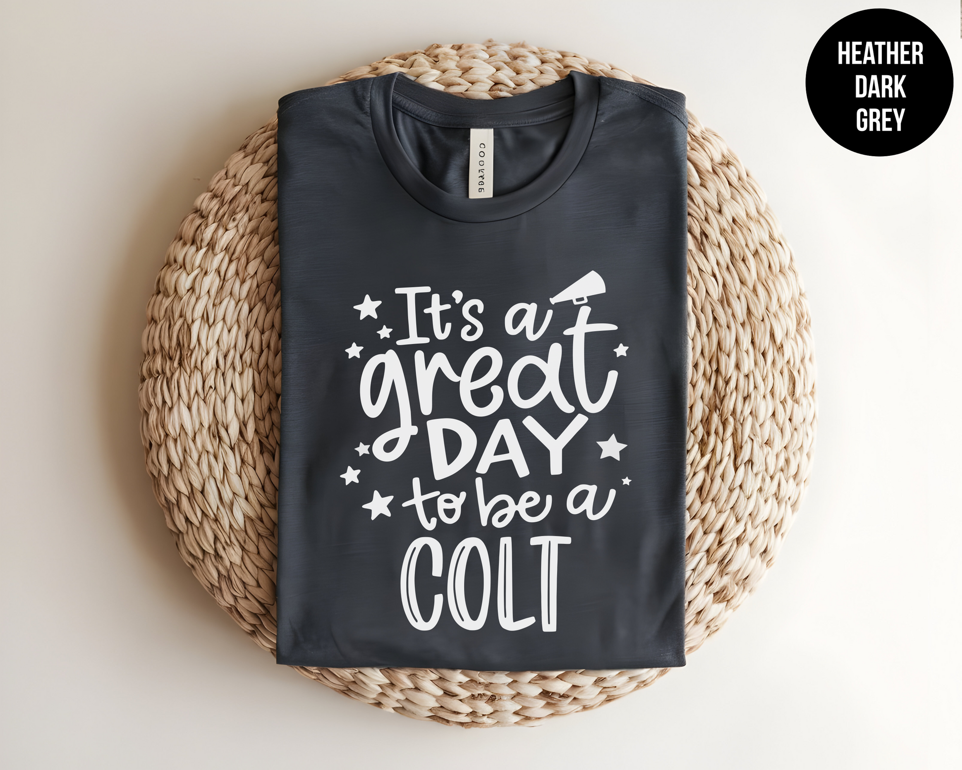 Start your day with school pride in this super-soft Bella + Canvas tee! Featuring the fun and uplifting “It’s a Great Day to Be a Colt” design with stars and a megaphone graphic, this shirt is the perfect way to show off your Colt spirit at school, games, or around town. Made with premium airlume combed and ring-spun cotton for all-day comfort.