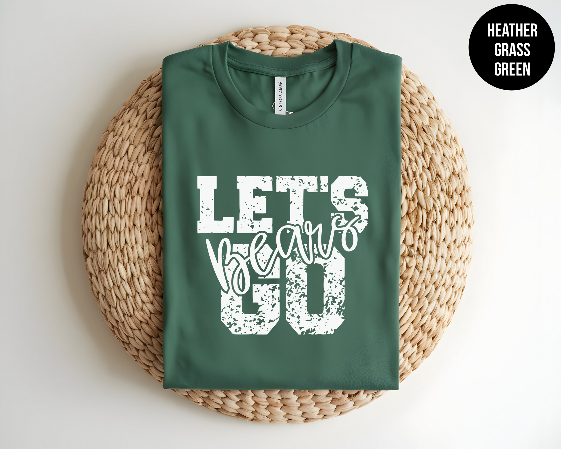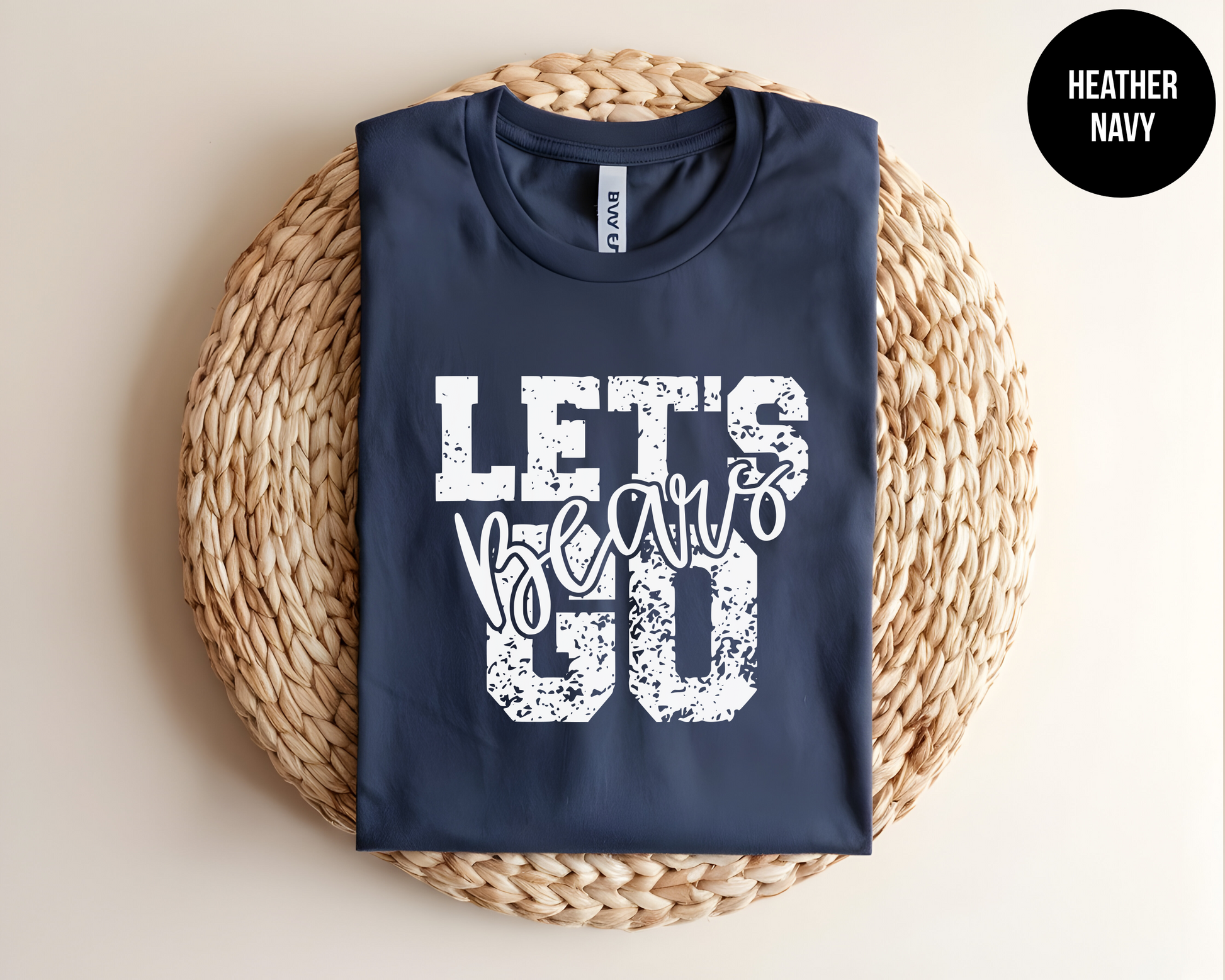 Bring the noise with this bold and spirited Let’s Go Bears tee! Featuring a dynamic mix of distressed varsity lettering and elegant script, this design is a perfect match for anyone who lives for game day energy and mascot pride.