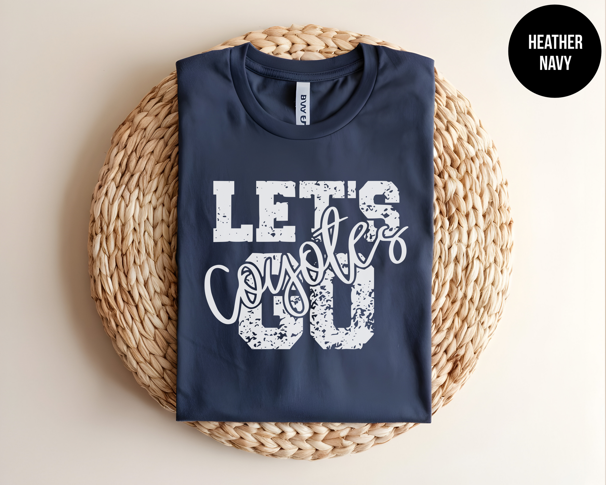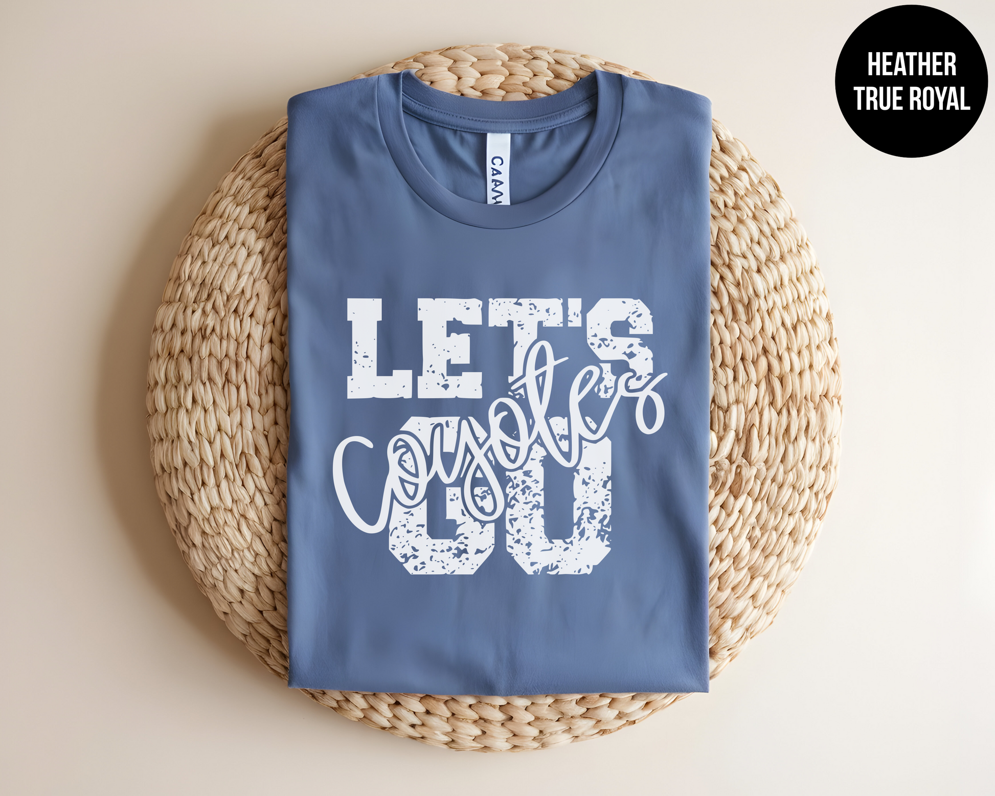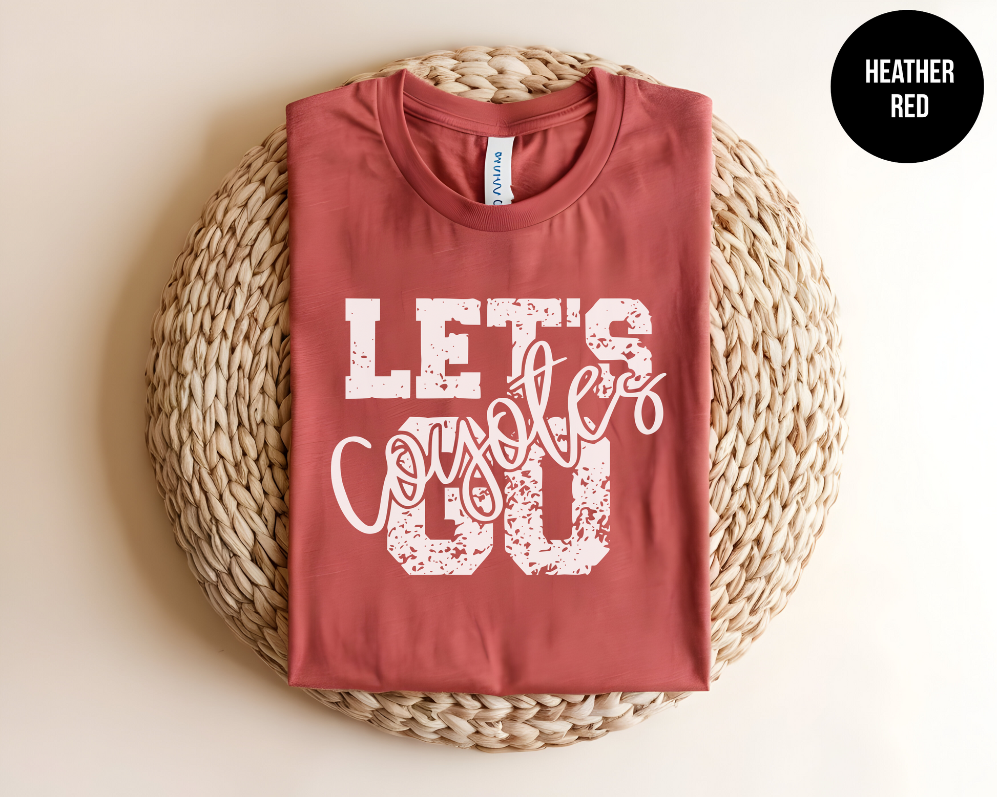 Rally your pack in style with this high-energy Let’s Go Coyotes tee. Featuring bold, distressed varsity lettering paired with dynamic script typography, this shirt is made for cheering loud and showing your mascot pride on and off the field.