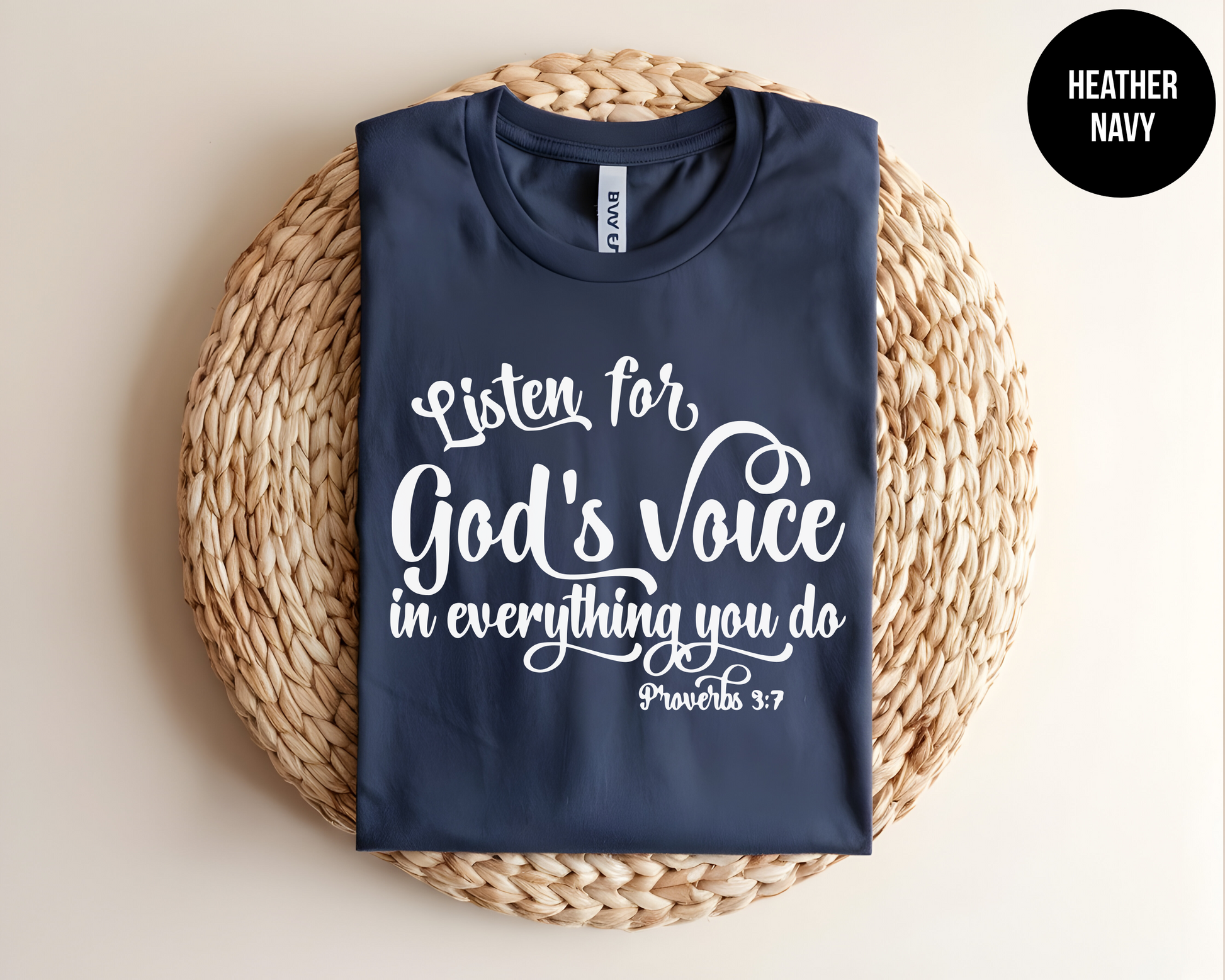 Our "Listen for God's Voice in Everything You Do" shirt is a daily reminder to seek divine guidance and stay grounded in your spiritual journey. Featuring a clean, uplifting design, it’s the perfect everyday piece for prayer groups, church, or just staying centered throughout your day.