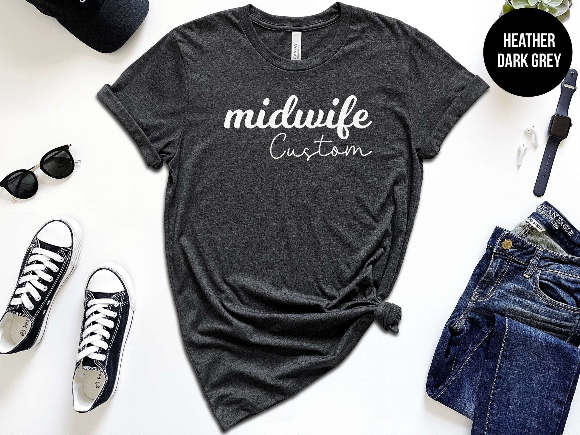 Dress up the perfect birth with the Midwife Custom tee from The Shirt Republic! Our personalized midwife shirt is sure to be the perfect fit for your big day, no matter how you deliver! Make a statement with its unique style and add a popular touch with its custom design. Be prepared to birth a new fashion trend in the delivery room!