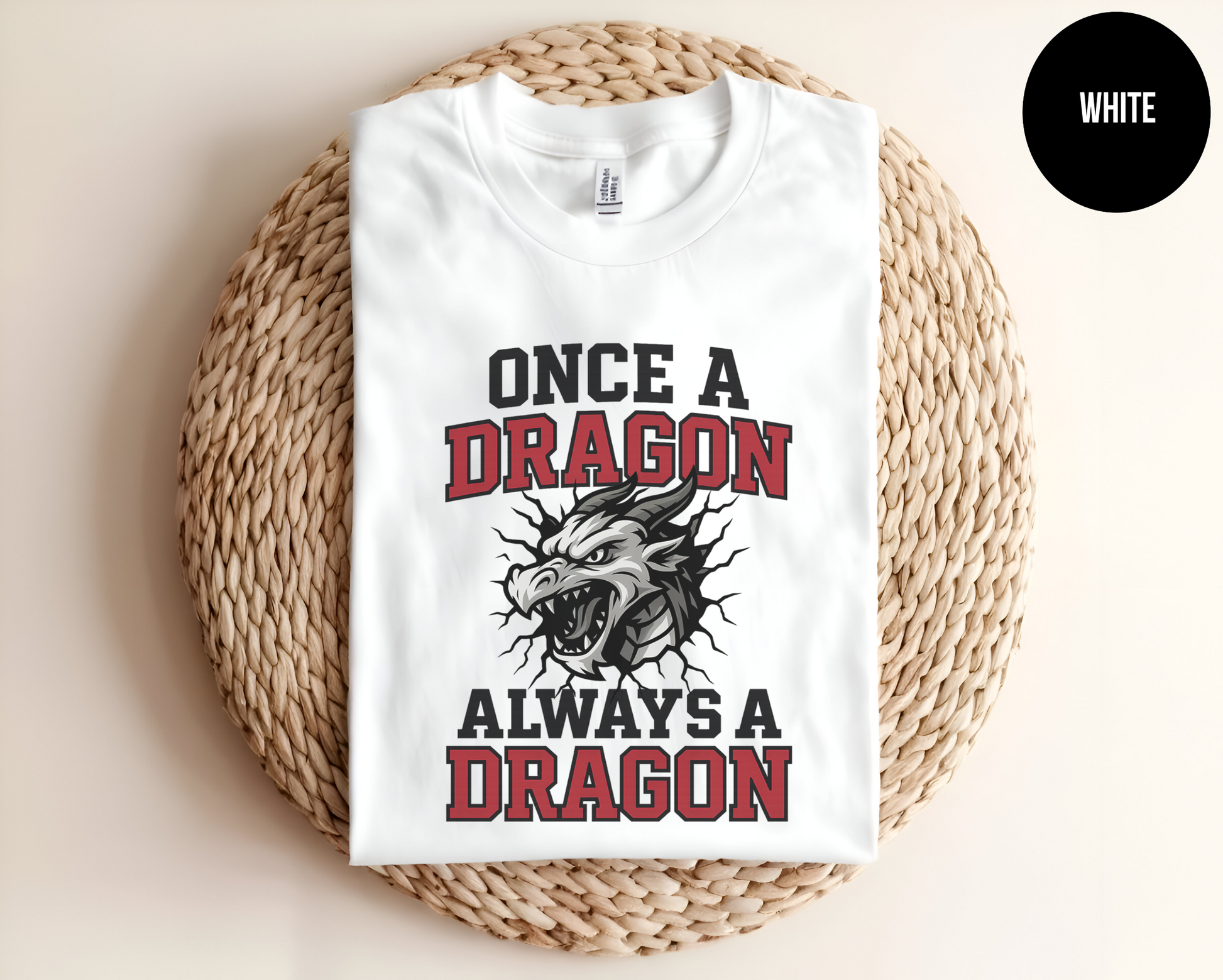 Bring the heat with this fierce “Once a Dragon, Always a Dragon” shirt. Featuring a snarling dragon mascot bursting through a cracked wall and bold varsity lettering, this tee is a must-have for anyone who bleeds red and black.