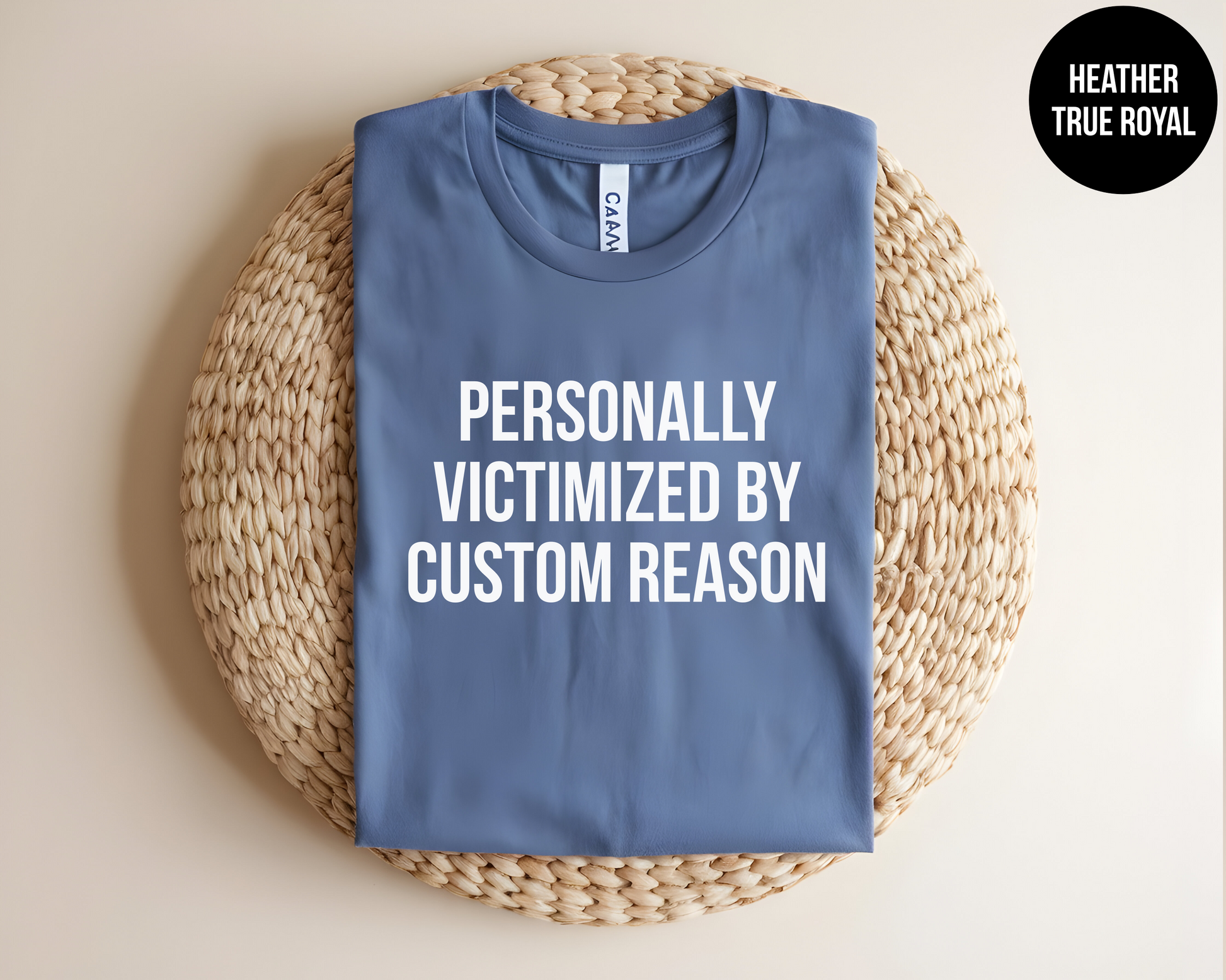 Embrace your humor with our "Personally Victimized by [Custom Text]" shirt! Perfect for adding a personalized touch, this tee lets you fill in the blank with anything—your boss, finals week, Mondays, your cat, or even a funny inside joke. Whether you're making a statement, gifting a friend, or just expressing your daily struggles in style, this soft and comfy shirt is sure to get laughs. Personalize it and make it yours!