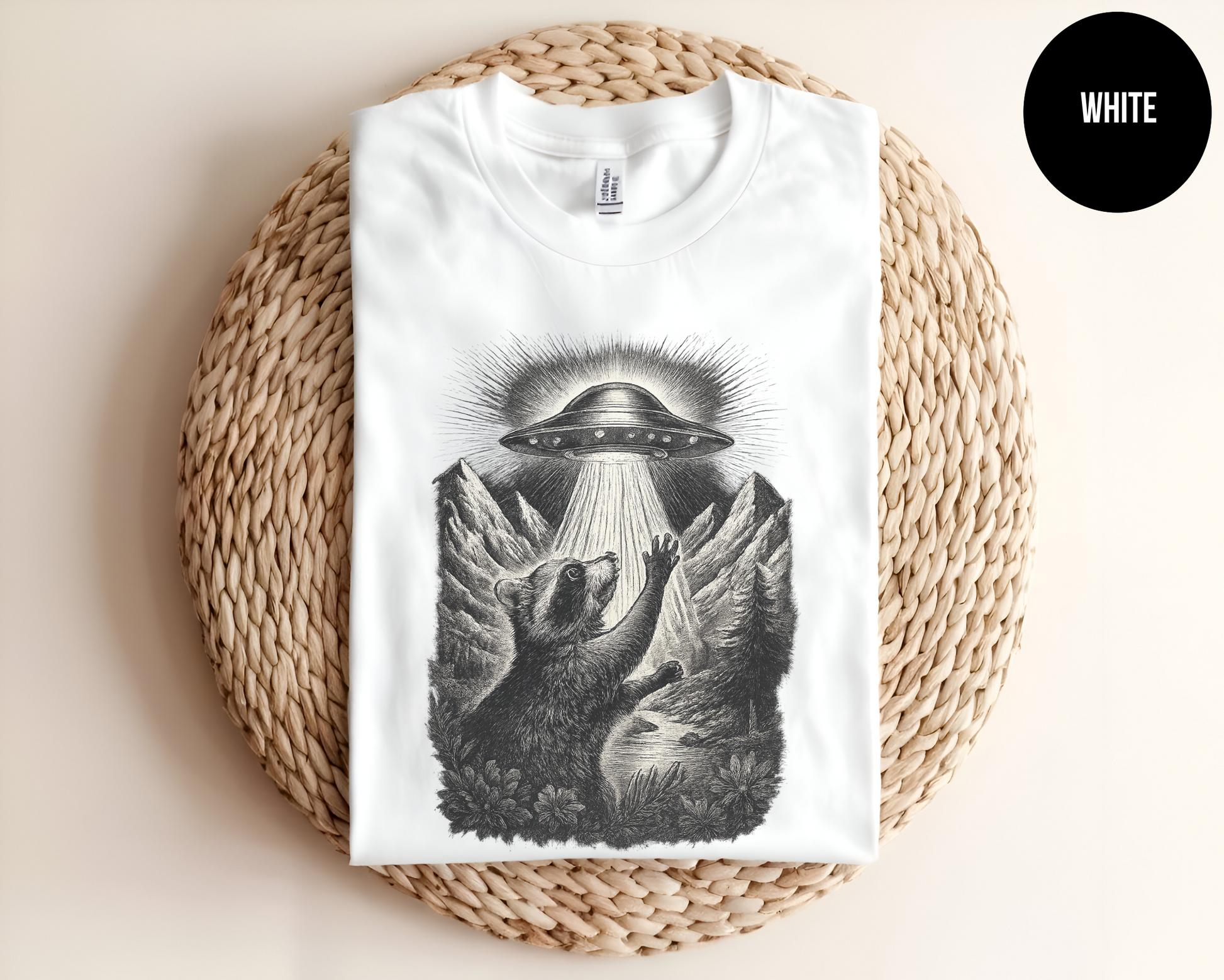 Printed in bold white ink on a soft black tee, this design pops with a retro-etched look that’s both mysterious and whimsical. Whether you're into aliens, raccoons, or just want a shirt that gets people talking — this is your perfect conversation starter.