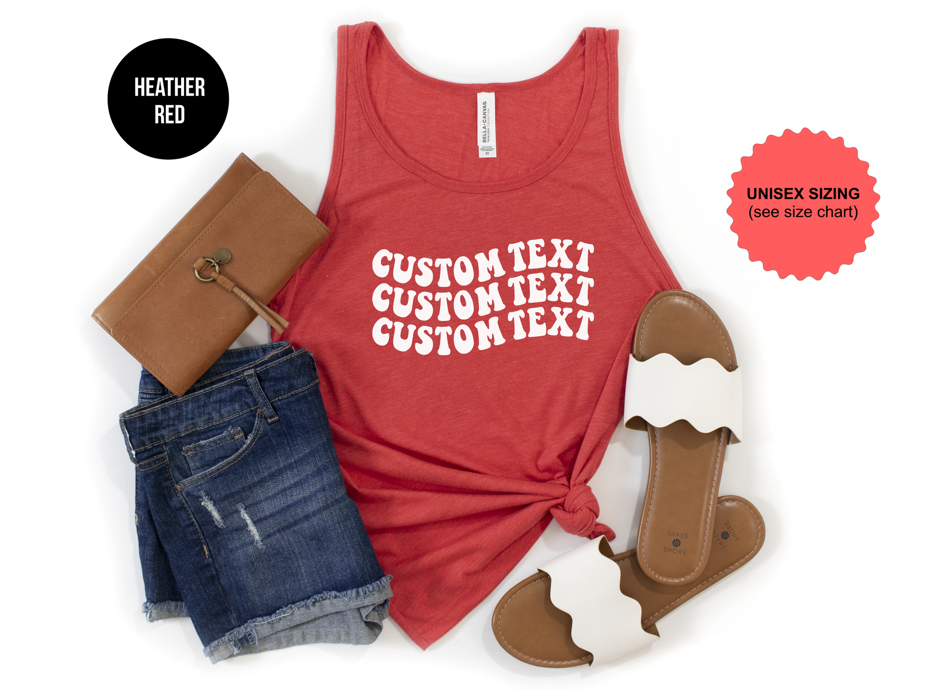 Be a trendsetter with the Retro Custom custom wavy text tank top from The Shirt Republic! It's the perfect way to make a statement and flaunt your style. Dare to be different and wave your own flag! One look and you'll know the old adage "go big or go home" applies to fashion, too.