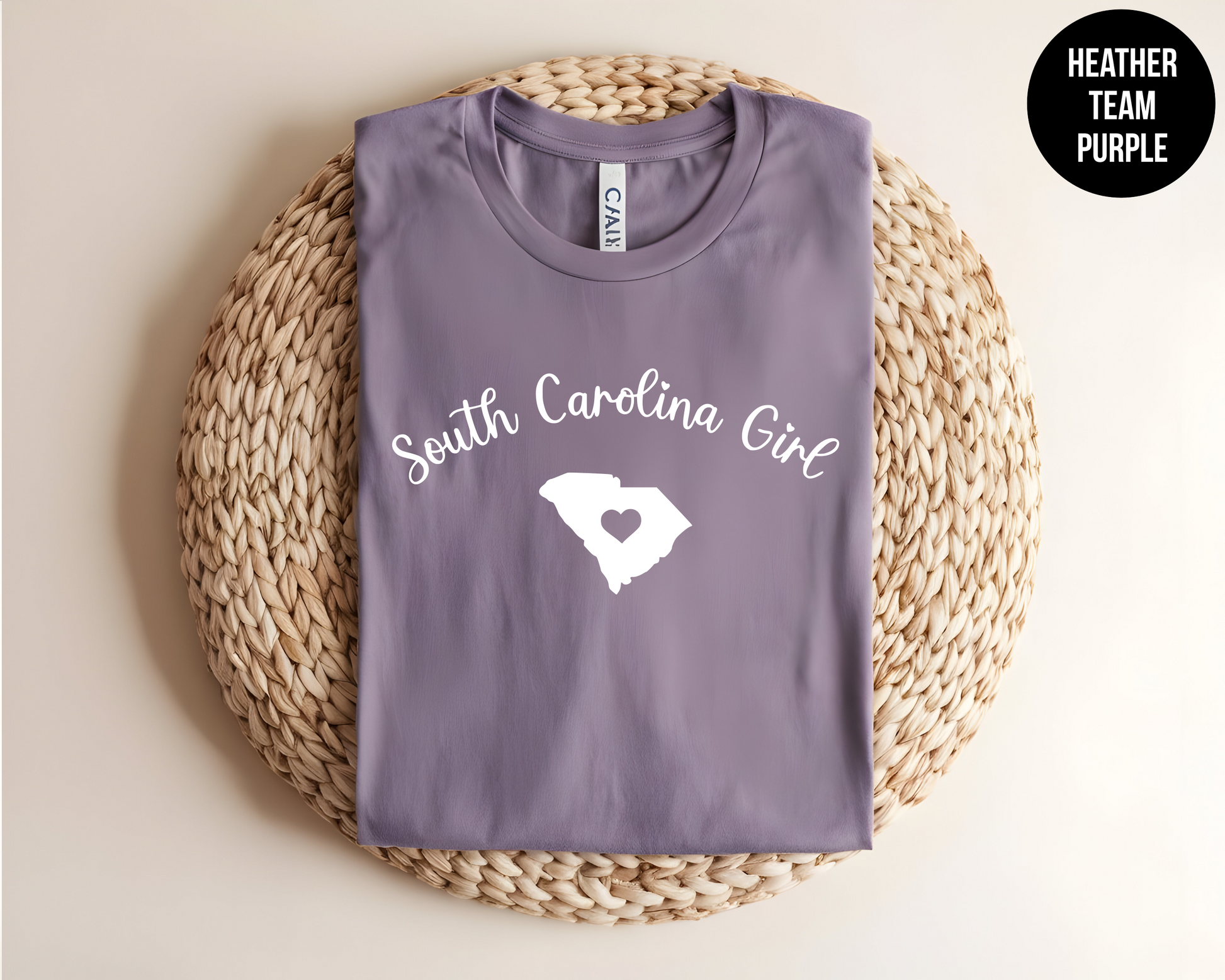 Show your love for the Palmetto State with our "South Carolina Girl" shirt! Whether you're from the sandy beaches of Myrtle Beach or the charming streets of Charleston, this shirt is perfect for any South Carolina girl who’s proud to call the state home.
