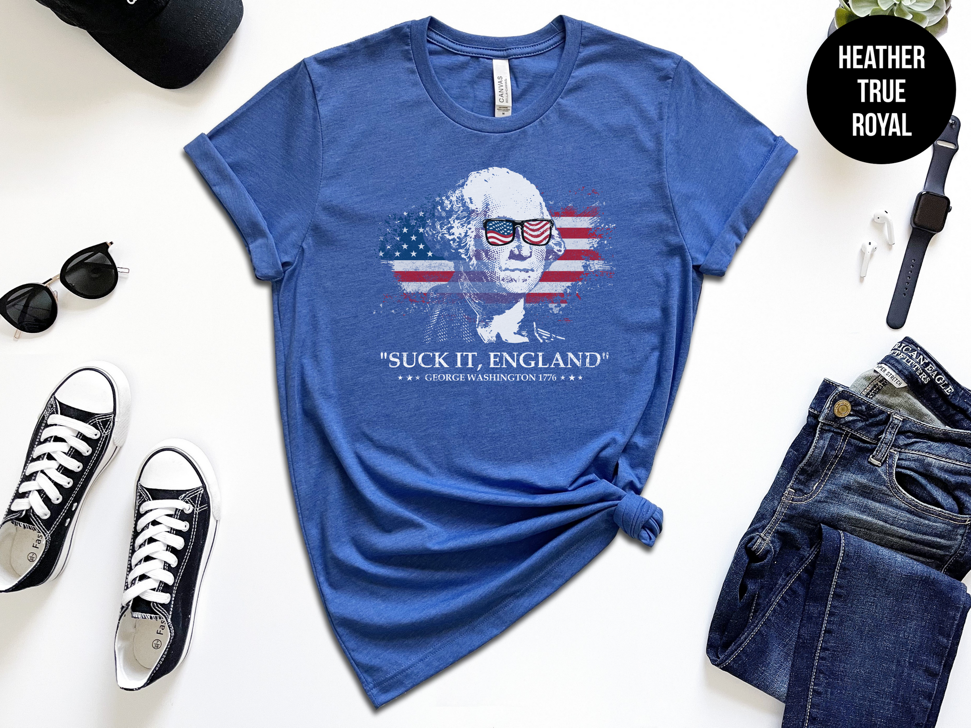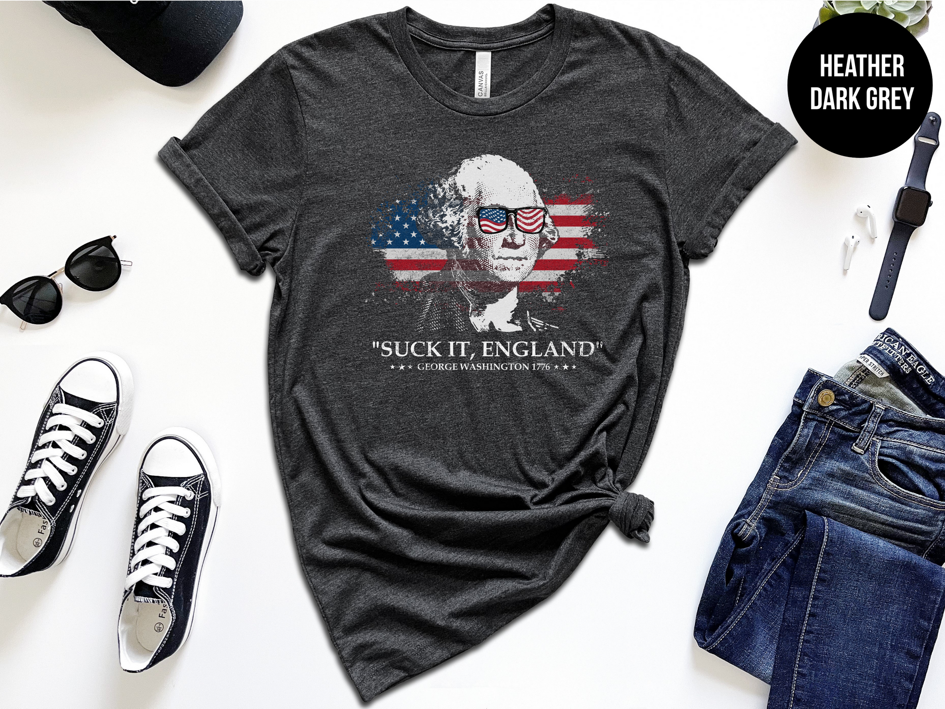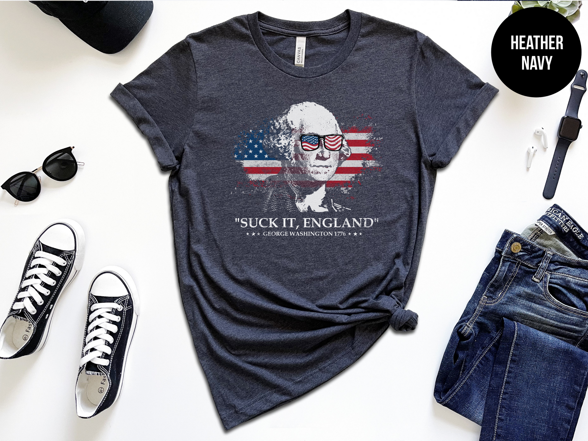 Embrace historical sass with our George Washington tribute shirt. Featuring a bold portrait of America's first president and patriotically declaring 'Suck it, England!' in spirited defiance, this shirt blends humor with history for a statement that's both cheeky and patriotic. Perfect for history buffs and anyone who loves a touch of irreverence with their fashion.