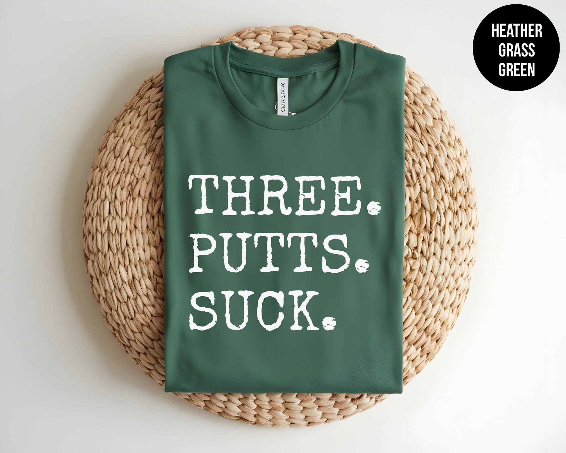 "Three Putts Suck" – For the golfer who knows the pain of missing that second putt. This funny golf tee is perfect for anyone who lives on the green and lives for the game. Whether you're shopping for yourself or the golf addict in your life, this shirt brings relatable humor straight to the fairway.