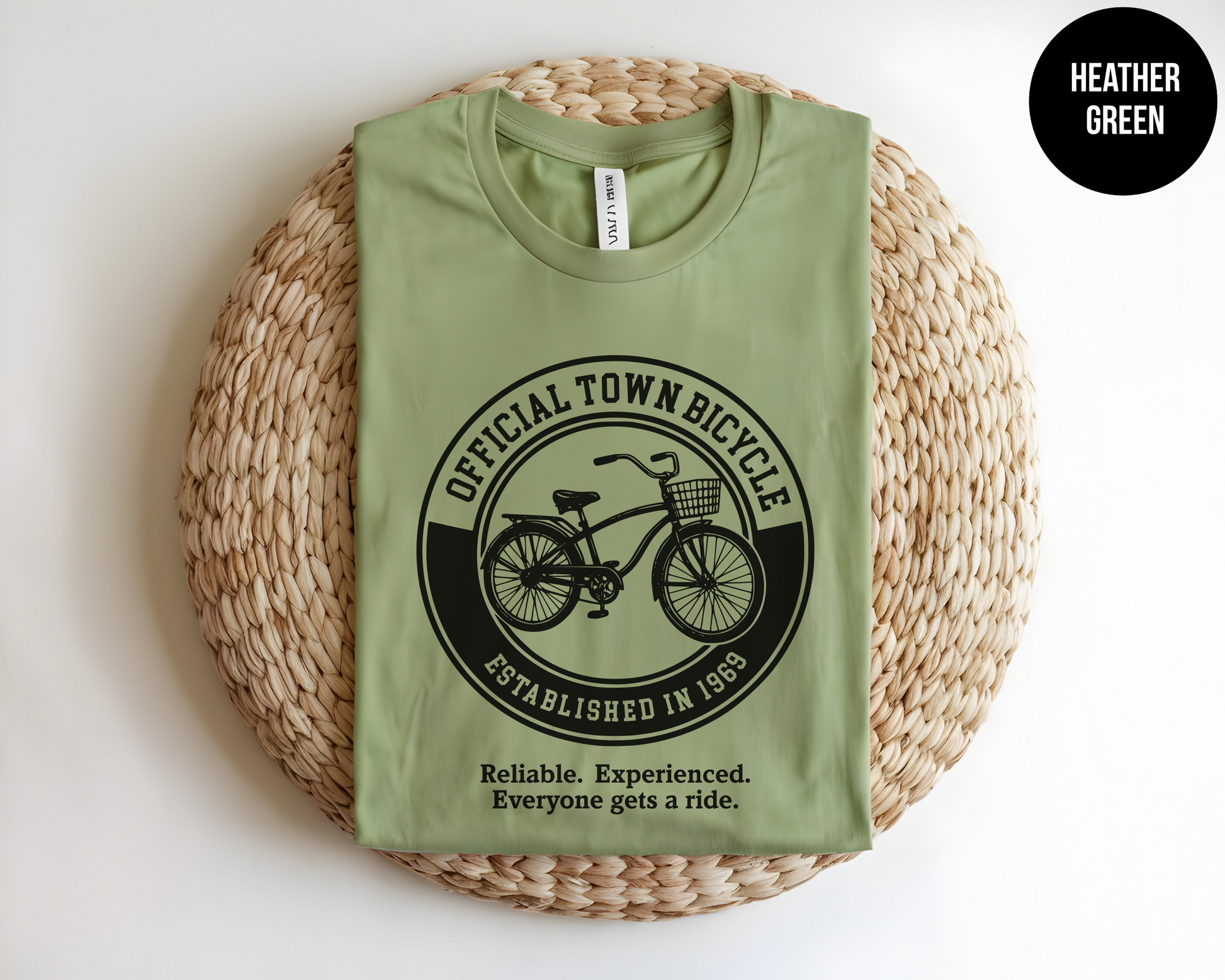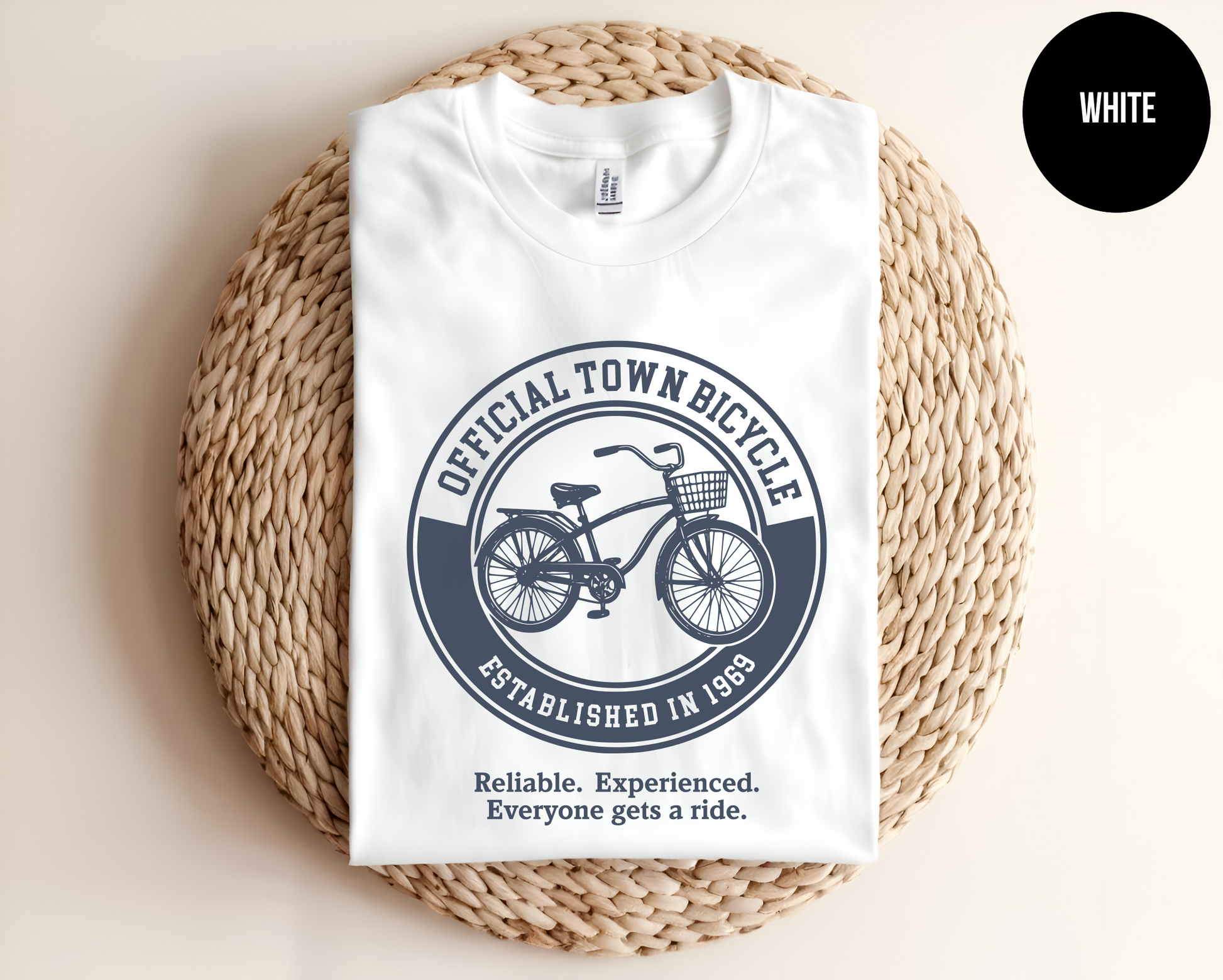 This "Official Town Bicycle" tee combines a classic 1960s-inspired seal with a playful, sarcastic punchline. Featuring a detailed cruiser bike illustration and the "Established 1969" tagline, this shirt is perfect for those who love retro aesthetics, bicycle culture, or just a good, cheeky joke.
