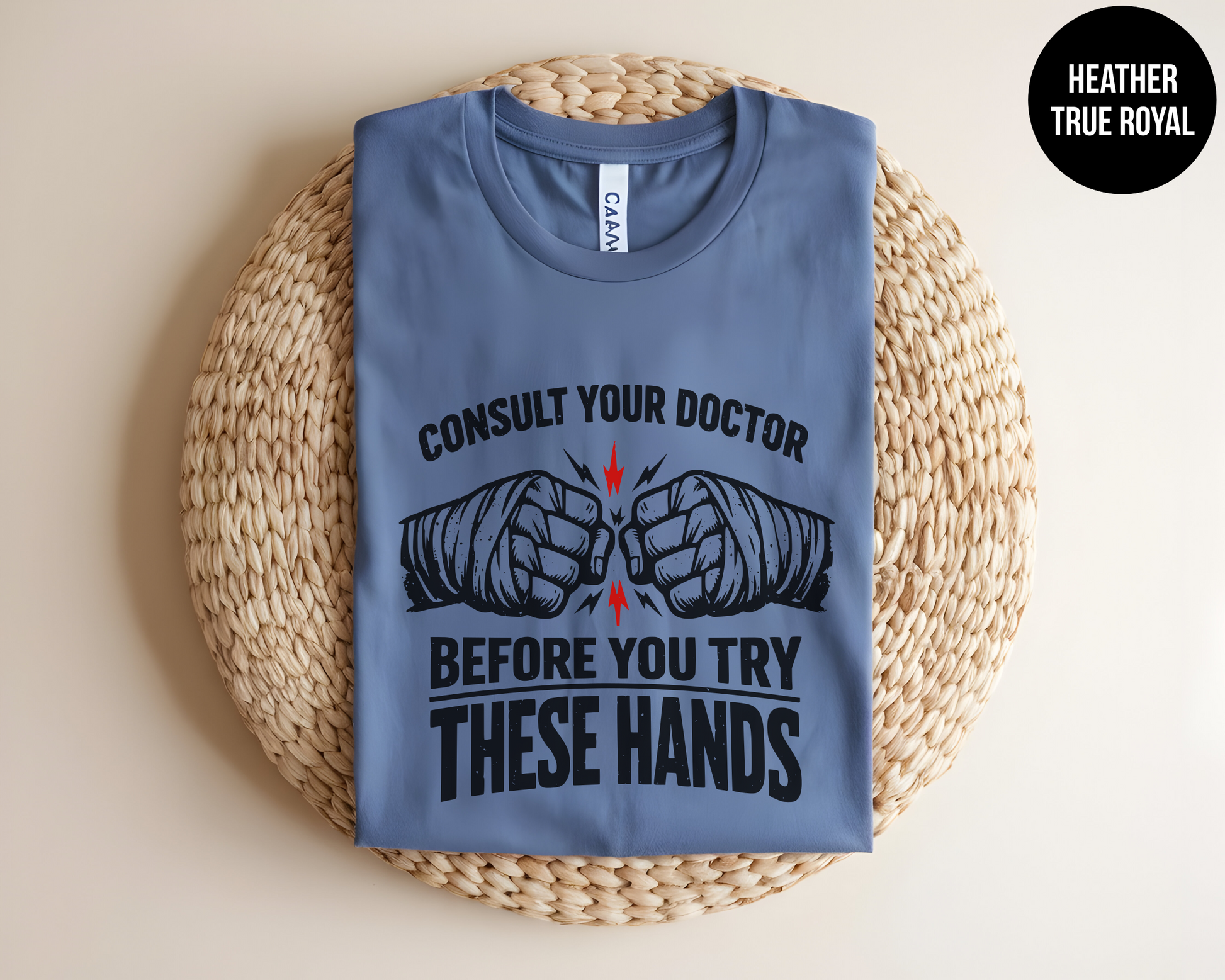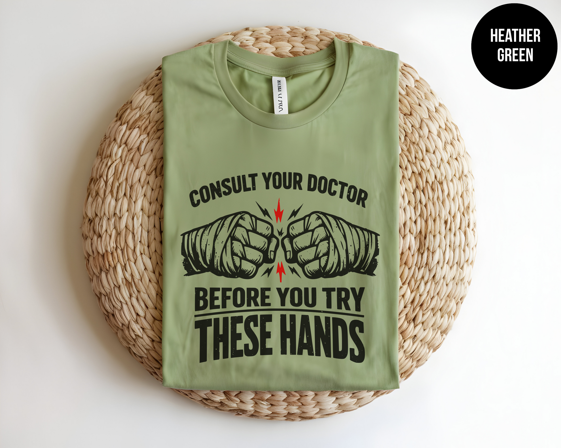 Make a statement without saying a word. This “Consult Your Doctor Before You Try These Hands” shirt delivers bold humor with a tough, no-nonsense edge — perfect for fighters, gym rats, and anyone who appreciates a little attitude.
