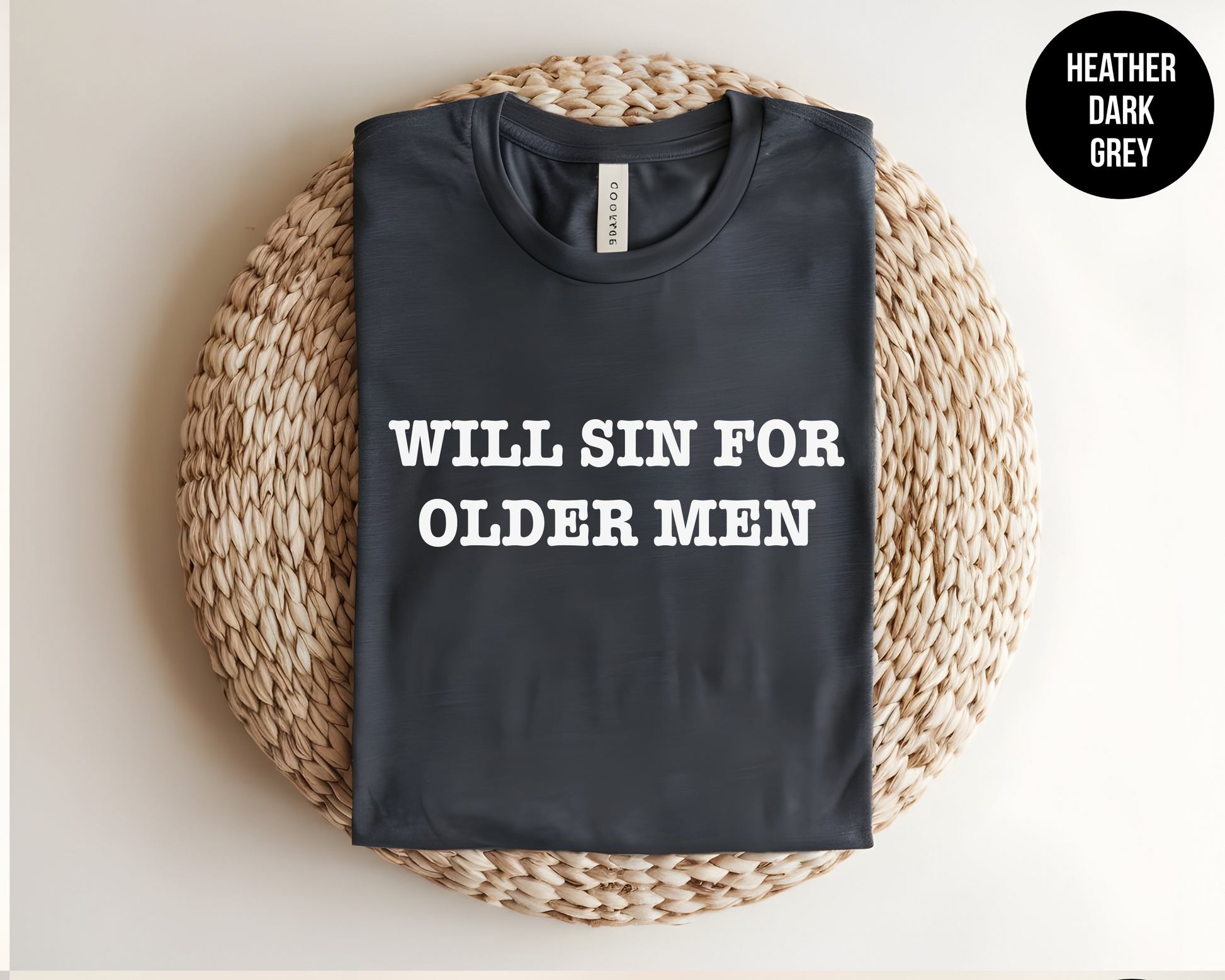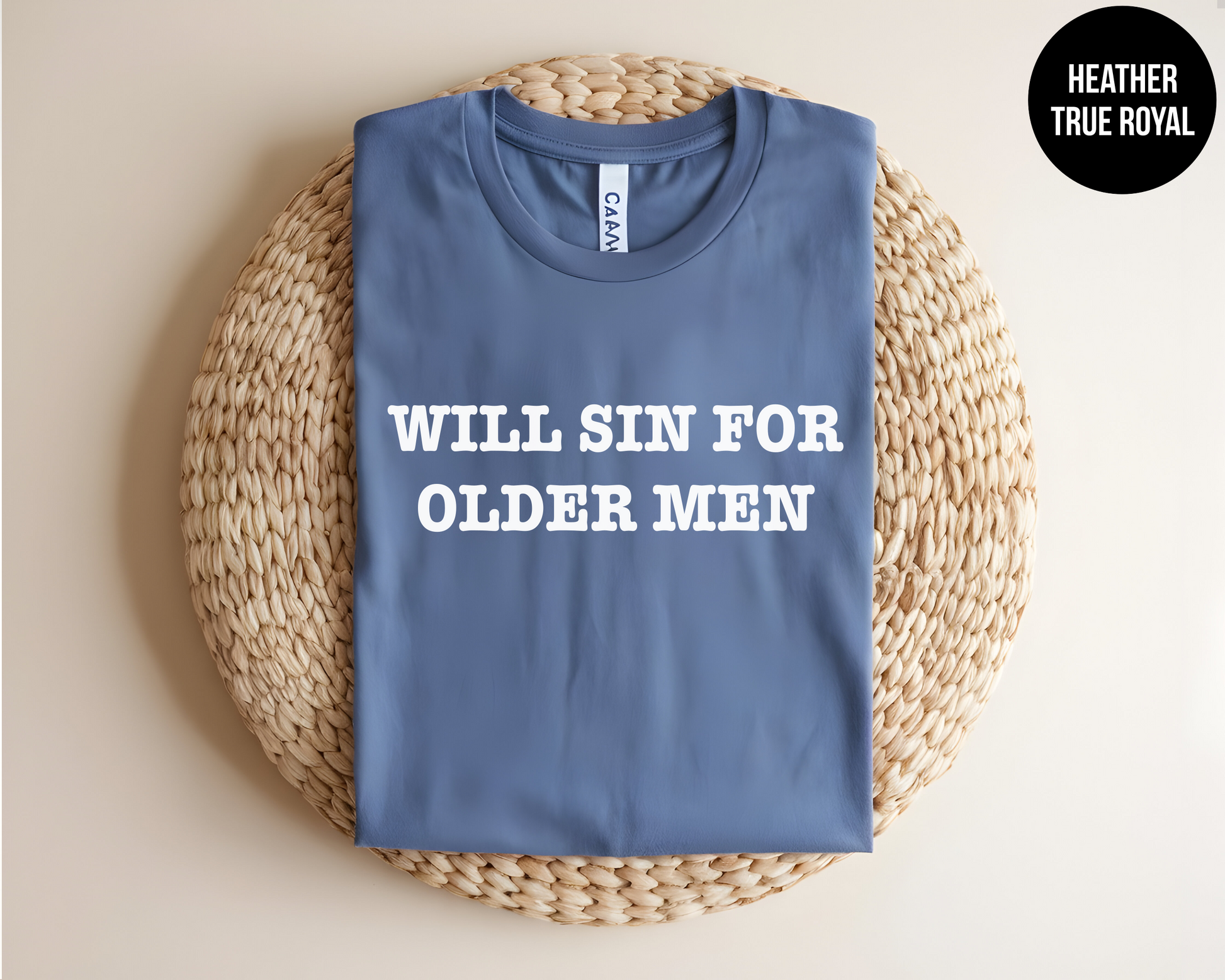 Turn heads and spark laughs with this bold and cheeky tee! Our "Will Sin for Older Men" shirt is made for those with a wicked sense of humor and a soft spot for silver foxes. Whether you're wearing it for laughs, flirty vibes, or to own your type with pride, this shirt is a fun conversation starter. Soft, comfortable, and made to last—perfect for parties, girls’ night, or casual wear.